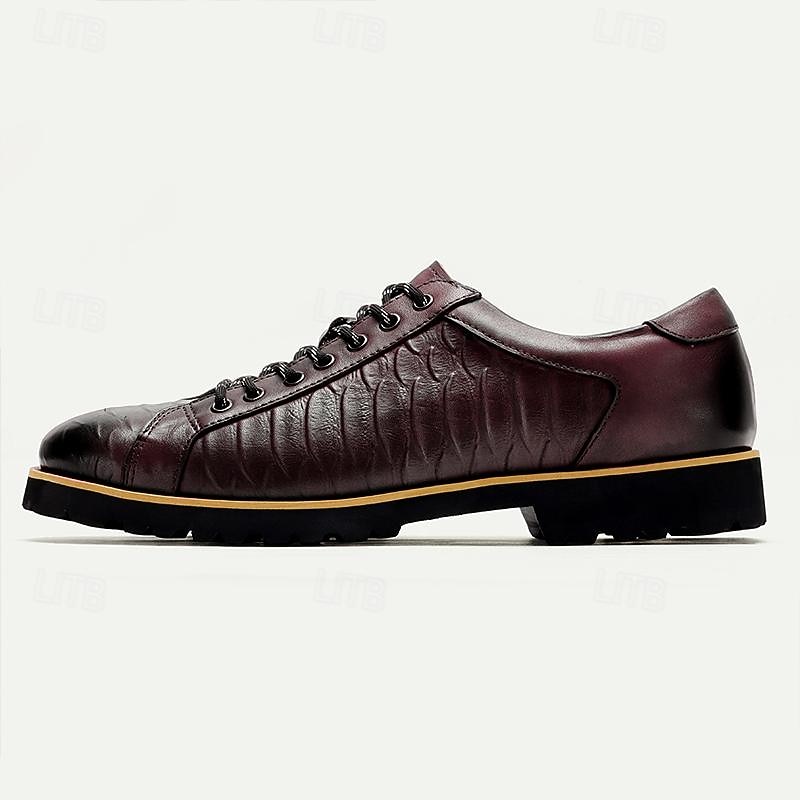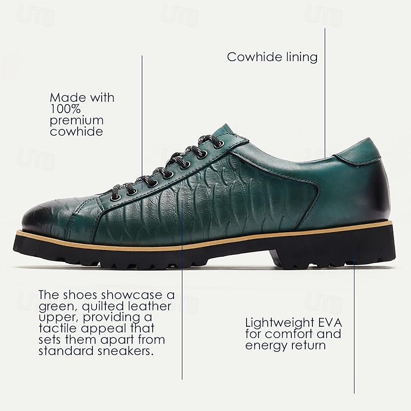 Highlights [Fabric] : Crafted from premium Italian full-grain cowhide leather, these men's dress sneakers offer both sophistication and durability, ensuring a luxurious feel with every wear. The unique textured design of the leather adds a modern and stylish touch. [Fit] : Featuring a classic round toe shape, these sneakers provide comfort and style, making them a perfect blend of casual and formal elements for versatile appeal. [Design Highlights] : The sneakers feature a rich green color contrasted by a slightly darker hue at the black toe cap, offering a striking visual appeal. The sturdy rugged black sole is complemented by a lace-up closure for a secure fit, ensuring excellent grip and comfort for everyday wear. The interior is lined with cowhide for added comfort and cushioning throughout the day. [Occasions] : Ideal for a variety of occasions, these dress sneakers seamlessly transition from casual gatherings to more formal settings, making them a versatile choice for daily wear or special events. [Size Guidance] : Available in a comprehensive range of sizes from US6 / EU39 / UK5 to US13 / EU46 / UK12, ensuring a perfect fit for most men seeking both style and comfort.