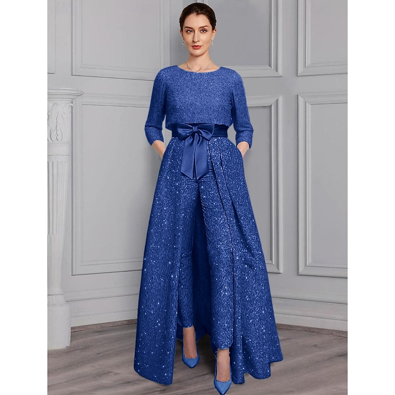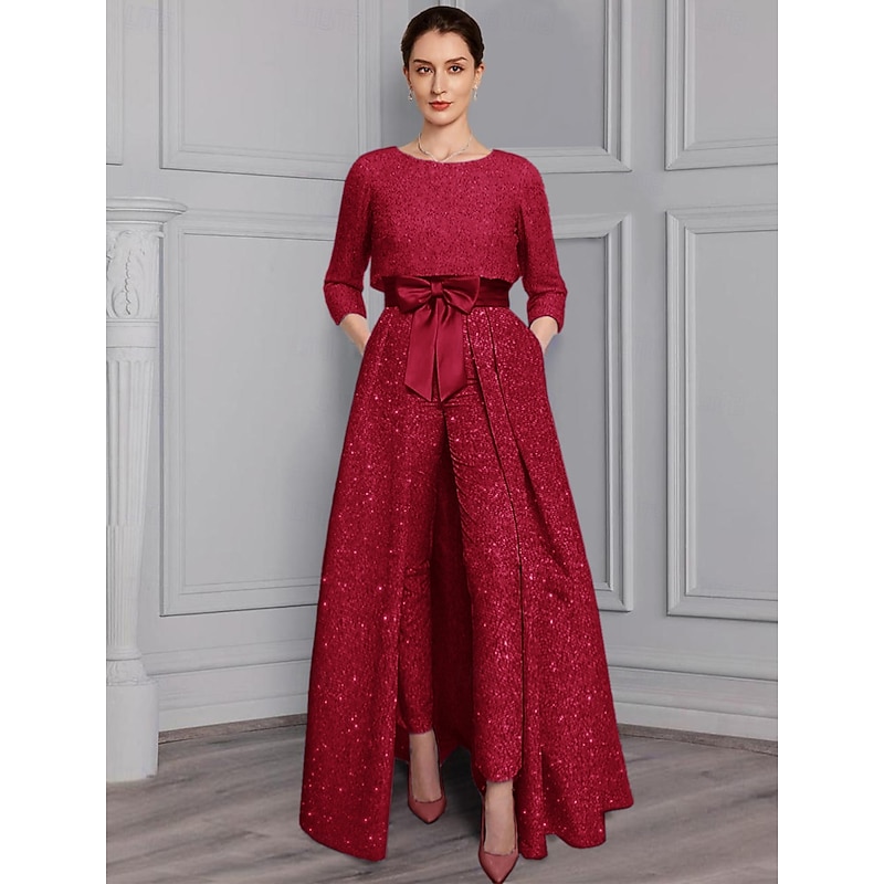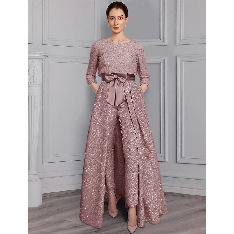More information about Two Piece Jumpsuit Mother of the Bride Formal Wedding Guest Elegant Sparkle & Shine Scoop Neck Ankle Length Satin 3/4 Length Sleeve with Bow(s)