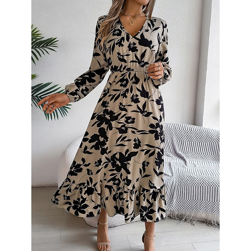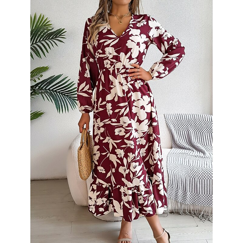 More information about Women's Midi Dress Casual Dress Swing Dress A Line Dress Stylish Casual Vacation Daily Regular Fit Leaf Long Sleeve V Neck Wine Khaki Spring Fall