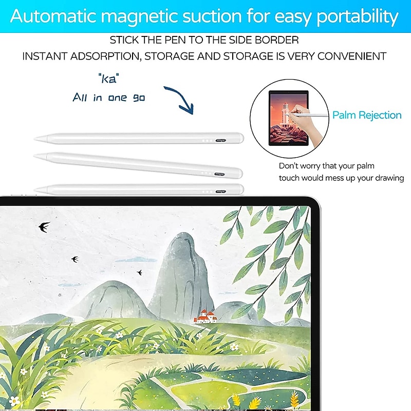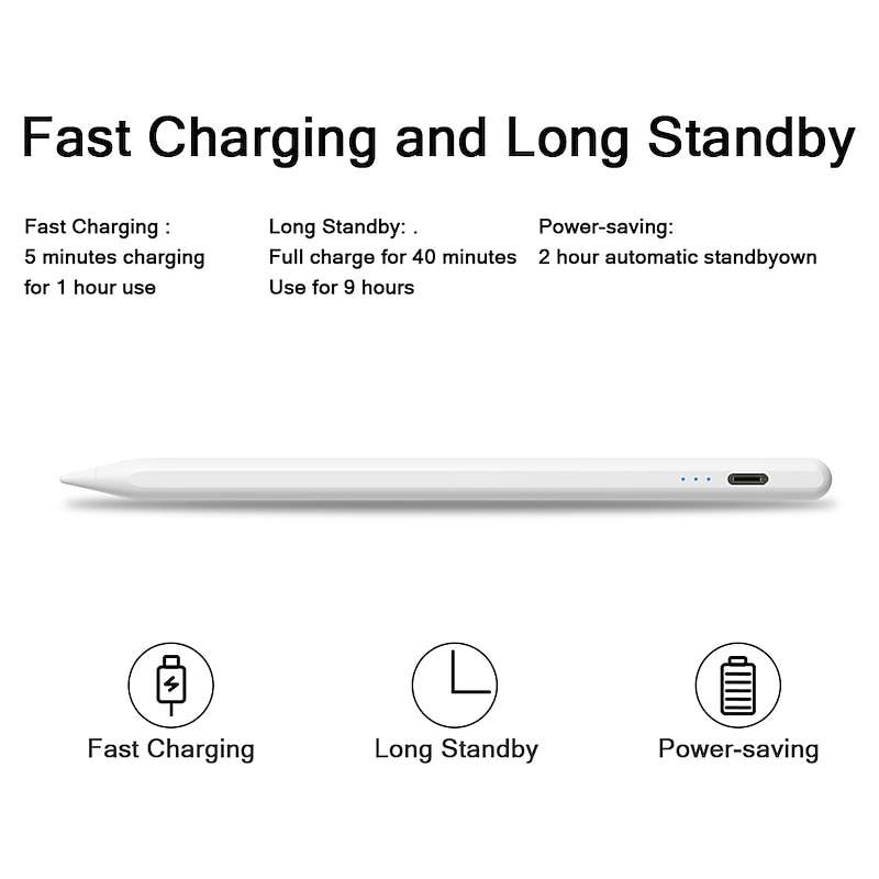 Highlights - Rapid charging: Fully charge your stylus pen in just 15 minutes! With our latest and improved battery, you'll get 8 hours of writing or drawing time with just 5 minutes of charging, unlike the old generation that takes hours to charge. - Compatible with Apple devices: Our stylus pencil is designed exclusively for Apple iPad, and is compatible with iPad 9.7 inch and 10.2 inch (6th - 9th Generation), iPad Air (3rd - 5th Generation), iPad Mini (5th/6th Generation), and iPad Pro 11 inch and 12.9 inch (3rd - 5th generation) - all versions after 2018. - Ease of use: Our stylus supports lateral tilt forward for smooth writing, and features an anti-mistouch function. It's also easy to connect to your iPad: just turn it on and it will automatically connect, with no Bluetooth or app required. - Palm rejection and magnetic suction: With palm rejection technology, you can comfortably draw or write without worrying about accidentally smudging your work. Plus, the stylus attaches easily next to your iPad for convenient carrying - thanks to the magnetic suction effect. - Accurate and precise: With the latest tip technology, our stylus achieves the highest accuracy and pixel-precision, offering a smooth writing experience with no delay. And with 2 tips included in your packing list, you'll always have a backup.