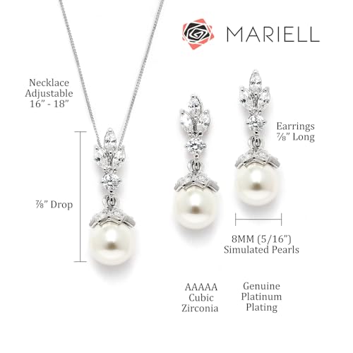 • LUXURY STYLE: Mariell's Wedding or Bridesmaid Necklace and Earrings Jewelry Set Features Marquis and Round-Cut Gems in a Platinum-Plated Setting with Soft Ivory Round Shape Pearl Drops