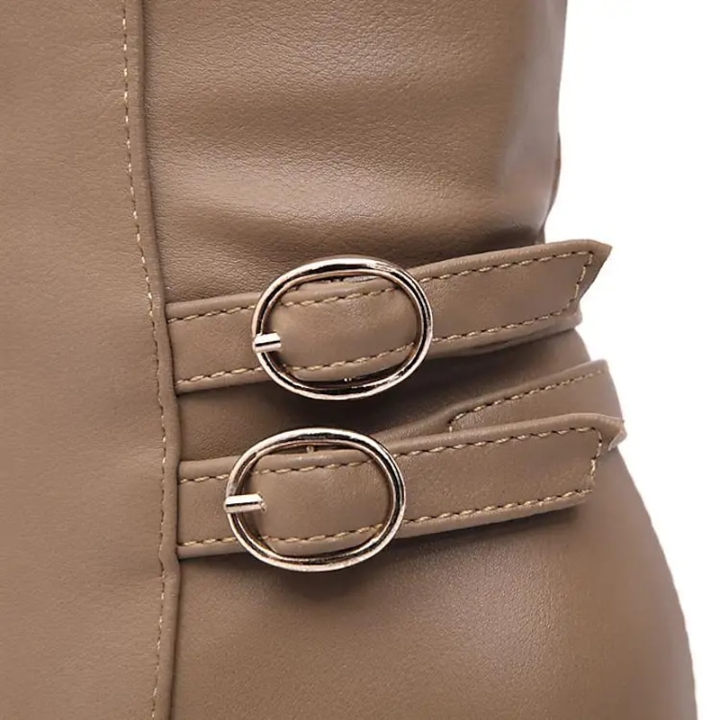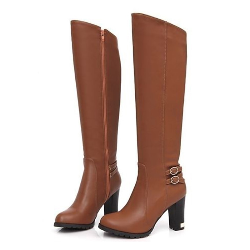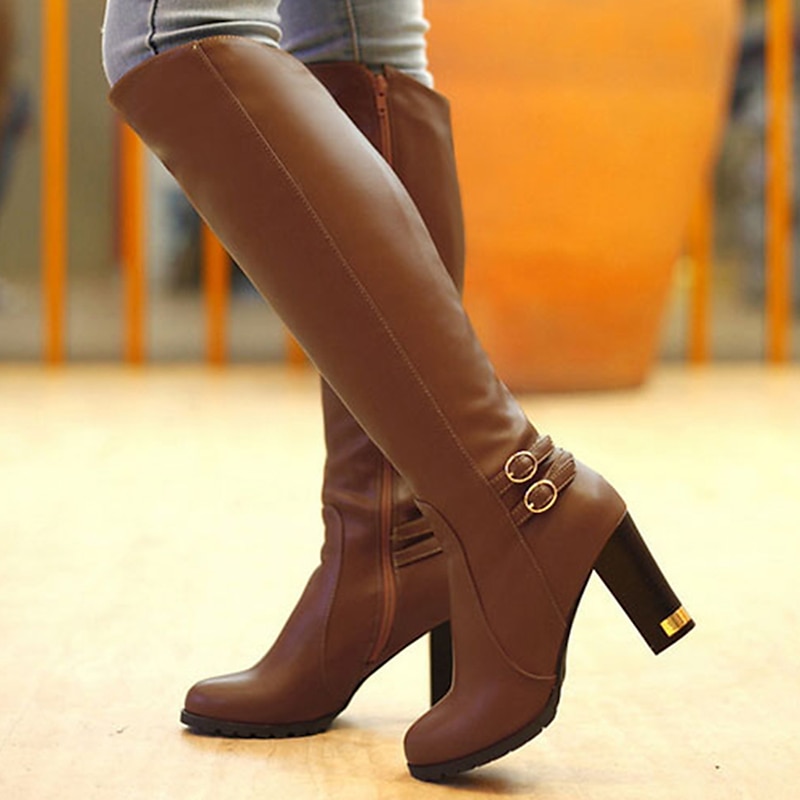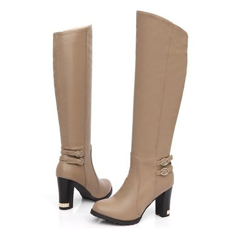 Highlights [Fabric] : Crafted from premium synthetic leather, these knee-high boots offer a sleek, polished look with added durability, perfect for the winter season. [Fit] : Featuring a classic knee-high design, these boots provide both style and functionality. The chunky, high block heel gives an elegant lift while ensuring comfort and stability, with a heel height ranging from 1-2 inches. [Design Highlights] : The boots are adorned with two decorative buckle straps around the calf and a practical side zipper, allowing for easy wear and a snug, secure fit. The round toe and solid colored pattern add a timeless touch to this versatile footwear. [Occasions] : Ideal for daily wear, these boots transition effortlessly from casual to formal settings. Whether you’re heading out for a day of shopping or attending a chic evening event, they add a trendy, sophisticated touch to any outfit. [Sizing] : Available in a variety of sizes ranging from US5 (EU35) to US10.5 (EU42), these boots cater to an array of foot sizes, ensuring a perfect fit for every woman.
