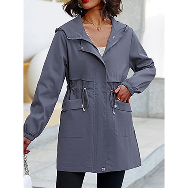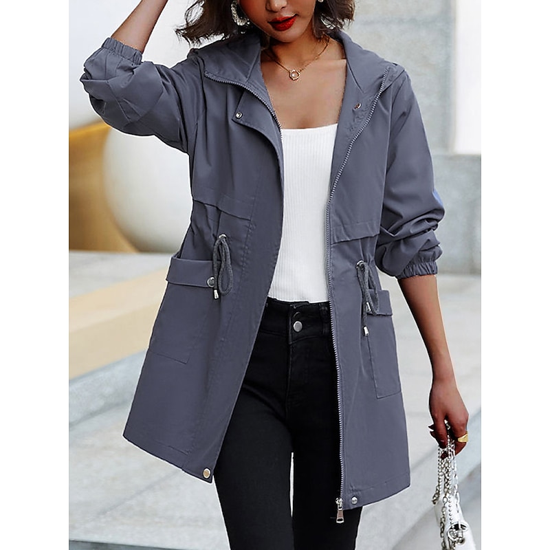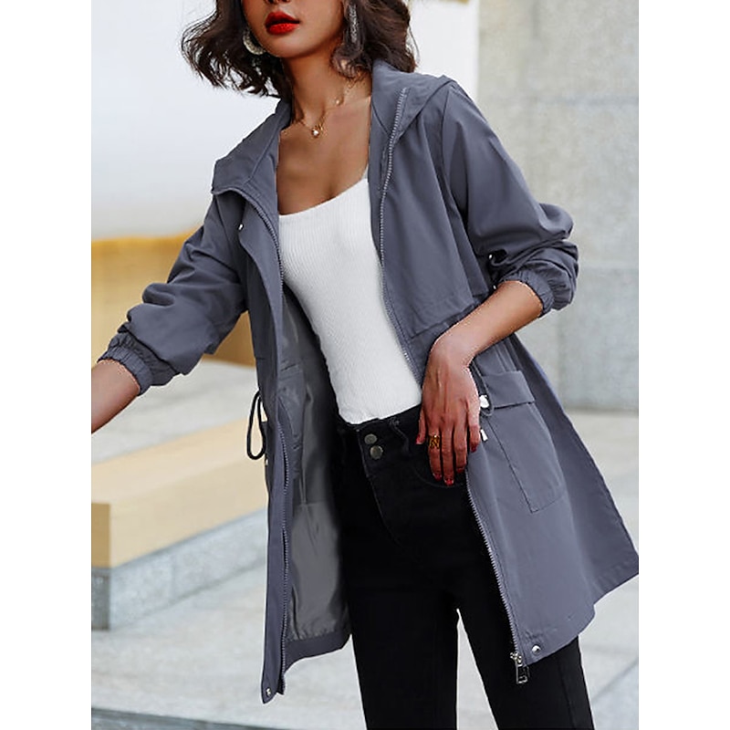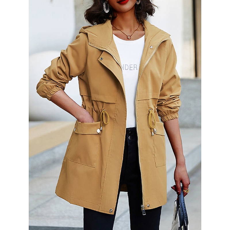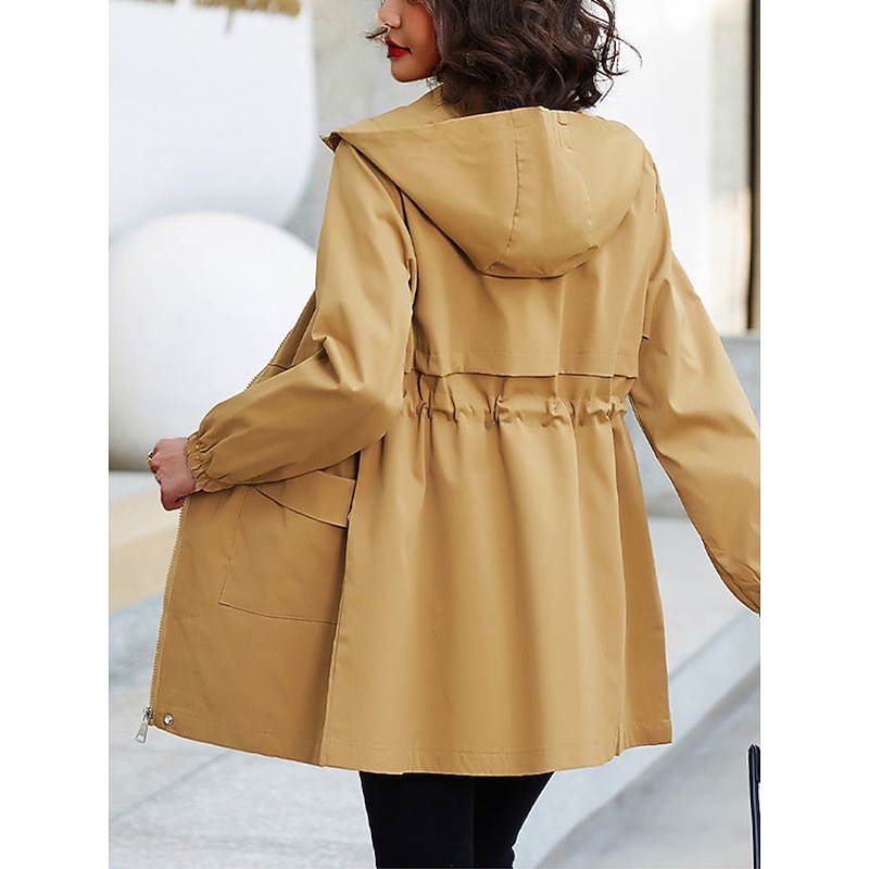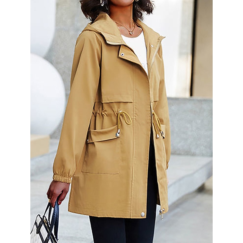 Highlights [Fabric]: Crafted from high-quality polyester, this trench coat offers a micro-elastic, breathable fabric that's perfect for the transitional seasons of summer and fall. Its lightweight, durable material ensures comfort and easy movement, making it a practical addition to any wardrobe. [Fit]: The regular fit design of this coat provides a relaxed yet polished silhouette that flatters a variety of body shapes. The drawstring waist allows for an adjustable fit, highlighting the wearer's natural shape. [Design Highlights]: This trench coat features a modern hoodie-style neckline for added warmth and versatility in unpredictable weather. The full-length zipper placket ensures easy wear, while the elastic cuffs keep the sleeves in place. Additional design elements include two front flap pockets for practical storage and a plain pattern that adds a touch of elegance. [Occasions]: Ideal for going out, work, business meetings, and various outdoor activities, this trench coat seamlessly blends fashion with functionality. Its stylish and modern design makes it suitable for both casual and semi-formal settings. [Size Range]: Available in a variety of sizes from M to 3XL, this trench coat accommodates diverse preferences and ensures a comfortable fit for different body types. The neutral color options of Black, Dark Gray, Beige, and Khaki enhance its versatility, making it easy to pair with different outfits.