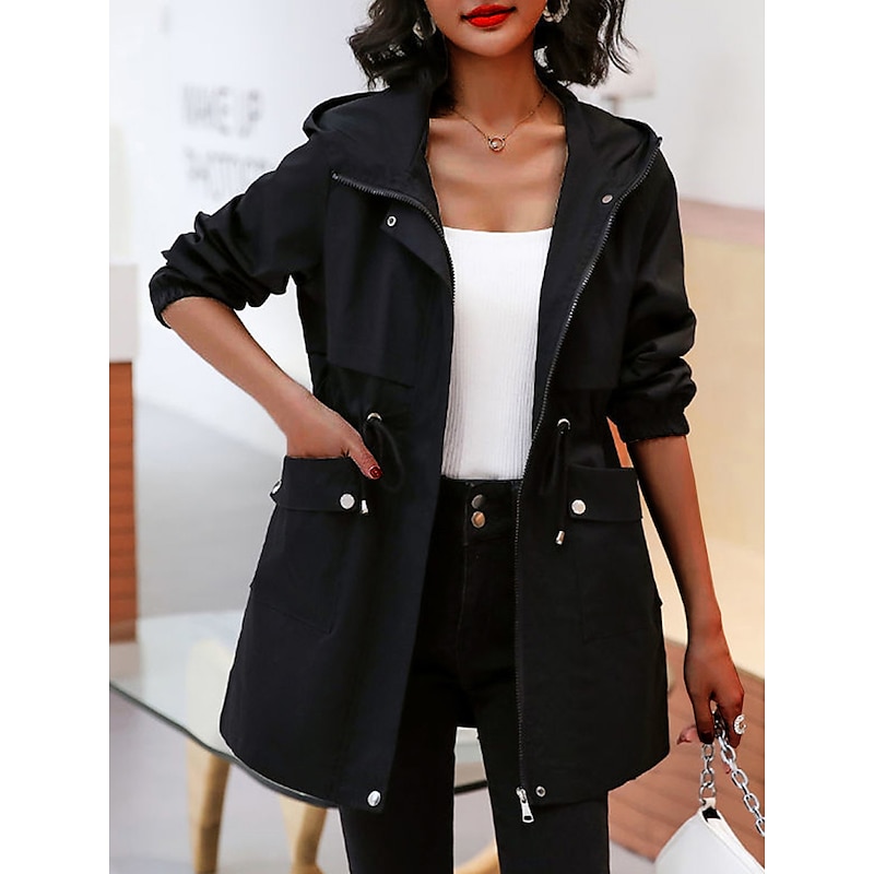 More information about Women's Trench Coat Fall Outdoor Zipper Plain Breathable Streetwear Regular Fit Outerwear Long Sleeve Black M