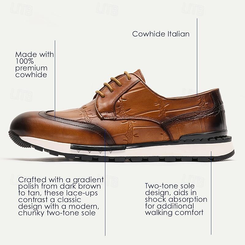 Highlights [Fabric] : Expertly crafted from Italian full-grain cowhide leather, these dress sneakers ensure a luxurious texture and superior durability. The premium cowhide lining further enhances the shoe's comfort and breathability. [Silhouette] : Designed with a timeless round toe and a classic lace-up closure, these sneakers provide an adjustable fit that is both secure and comfortable. The sturdy EVA outsole contributes to its slip-resistant functionality, making it perfect for various surfaces. [Design Highlights] : The shoes boast an elegantly embossed texture on the upper, delivering a sophisticated and unique aesthetic. The rich brown color, featuring a subtle ombre effect at the toe and heel, adds depth and visual interest to the overall design. [Occasions] : Ideal for both formal events and smart-casual gatherings, these sneakers effortlessly elevate any attire. Their modern yet classic style makes them perfect for office wear, evening outings, or weekend casuals, blending seamlessly into a variety of settings. [Size Notice] : Available in a range of sizes from US6 to US13 (EU39 to EU46, UK5 to UK12), these sneakers cater to a wide audience, ensuring a perfect fit for different foot sizes.