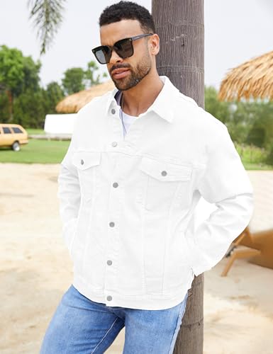 • 【Advantages of White Mens Jean Jacket】Button front design of mens jacket white is fashion and easy to put on and take off.Two flap button pockets,both sides pockets,two inner large pockets provide ample space for carrying daily essentials.Adjustable loop at the hem and buttons on the cuffs of white jean jacket facilitate adjustment of fit and enhance comfort.Men's jacket adopts fine sewing technology,reinforced shoulder stitching,enhances durability,ensures that you stay comforty all day long.