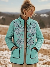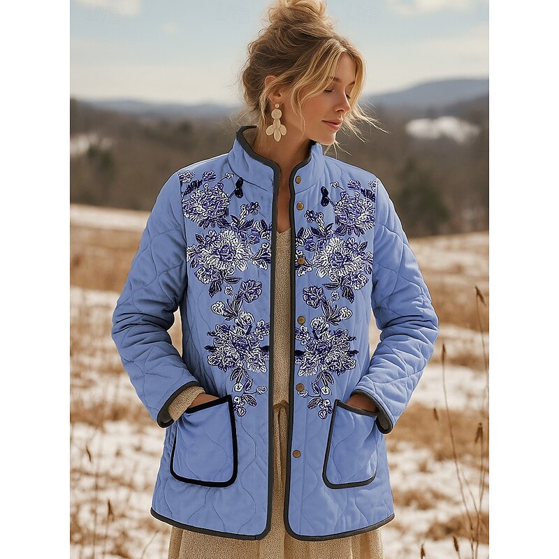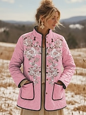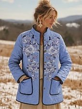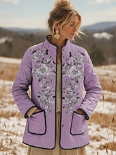 More information about Women's Winter Jacket Quilted Jacket Warm Lightweight Embroidered Print Active Vintage Cute Artistic Floral Casual Short Stand Collar Regular Fit Long Sleeve Outerwear Pink Blue Purple Fall Winter