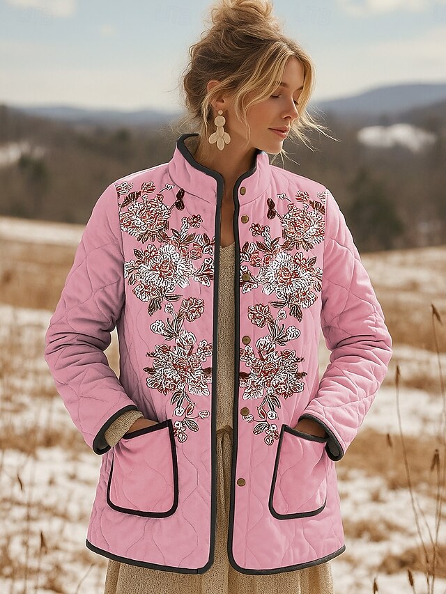 HOT ! Women's Winter Jacket Quilted Jacket Warm Lightweight Embroidered Print Active Vintage Cute Artistic Floral Casual Short Stand Collar Regular Fit Long Sleeve Outerwear Pink Blue Purple Fall Winter