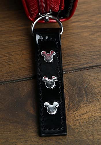 • Stylish Design: Crafted from red faux patent leather with black stripes, this wallet features embossed Mickey and Minnie silhouettes, adding a touch of Disney magic to your everyday style.