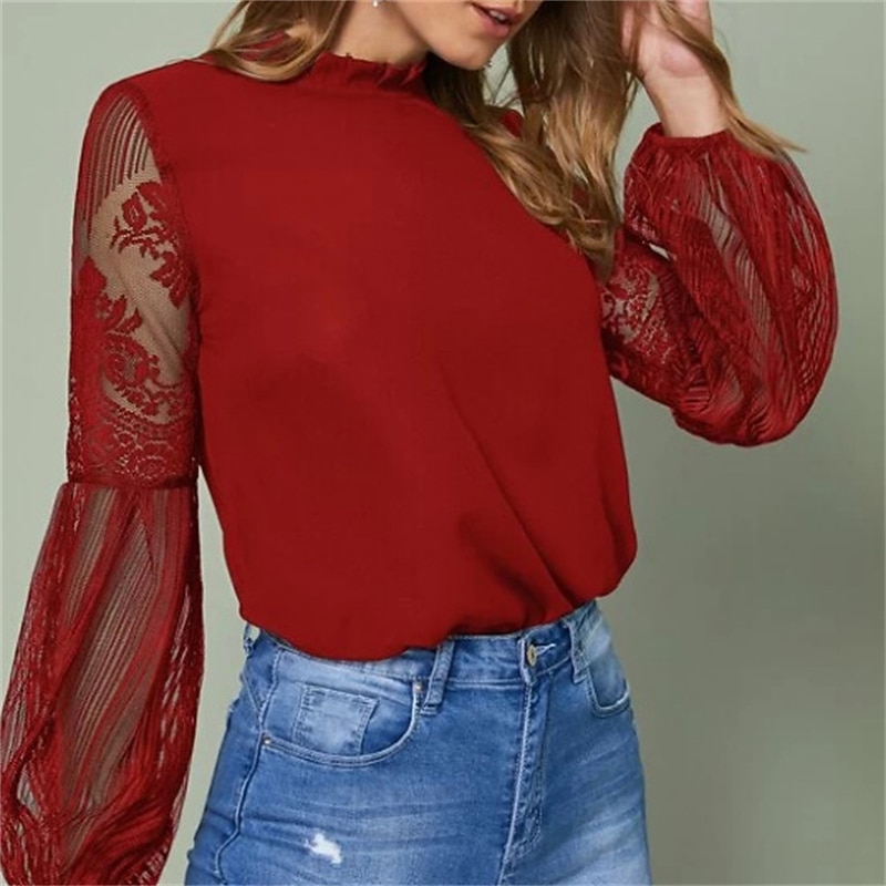 Women's Boho Shirt Lace Shirt Blouse Mesh Patchwork Top Solid / Plain Color Classic Lace Sweet Lantern Sleeve Party Daily Going out Embroidery Black Wine Dark Blue Spring &  Fall Fall & Winter 5