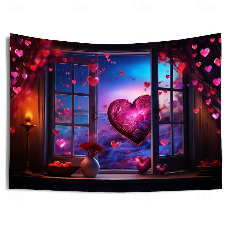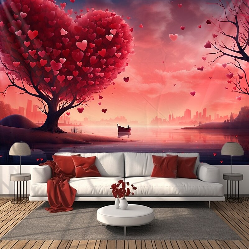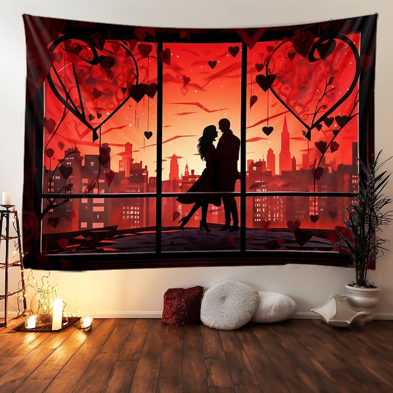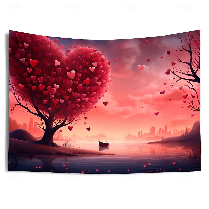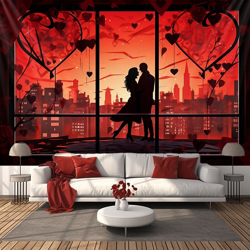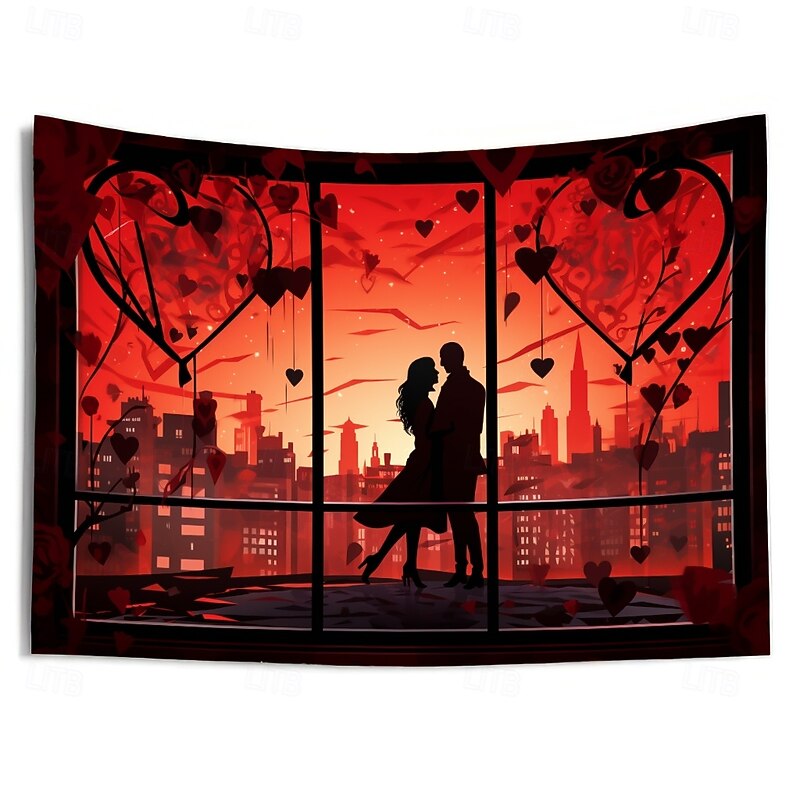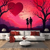 Highlights [Fabric] : Crafted from high-quality polyester, this Valentine's Day Hanging Tapestry ensures durability and vibrant color retention. The soft texture allows for easy draping, making it suitable for various uses from wall decor to unique curtains. [Design] : The tapestry showcases a breathtaking scene of a vibrant pink and red sunset, silhouetted by a couple holding hands, creating a romantic atmosphere. Floating hearts in the sky add a whimsical and heartfelt touch, perfect for enhancing the feel of love and warmth in any room. [Design Highlights] : A large rectangular shape offers versatility in placement, whether it be on walls or as an innovative bedspread. The classic style seamlessly complements both modern and traditional interiors, making it a staple piece of decor. [Occasions] : Ideal for infusing romantic charm into bedrooms and living rooms, this tapestry is perfect for Valentine's Day celebrations, anniversaries, or as a thoughtful gift for loved ones. Its timeless design adds elegance to special moments and everyday settings alike. [Size Range] : Available in the size of 150cm by 130cm, this tapestry fits a wide range of spaces, easily adapting to enhance your home’s aesthetic.