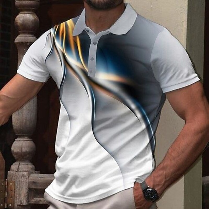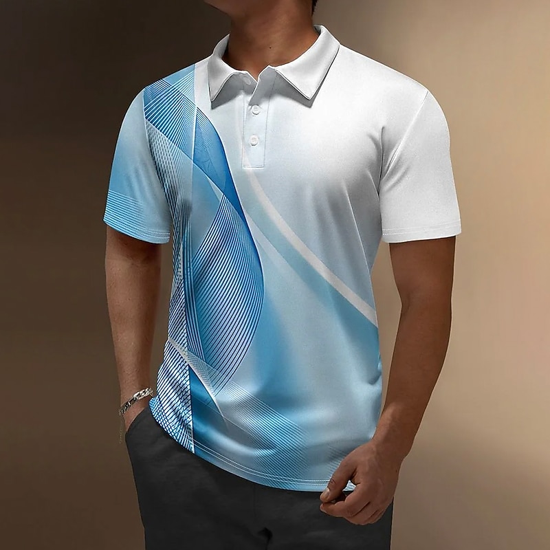 Highlights [Fabric] Crafted from a breathable and lightweight fabric, this men’s polo shirt is designed for comfort and style, making it an ideal choice for warmer weather. The material blend offers a soft touch against the skin while ensuring durability through multiple wears. [Fit] The tailored fit enhances a masculine silhouette, providing a comfortable yet fitted appearance that is flattering and versatile. The classic collar and button placket maintain the traditional polo style with a modern twist. [Design Highlights] Featuring an abstract geometric pattern in shades of blue, dark blue, light blue, and gray, this polo shirt adds a modern artistic flair to any outfit. The dynamic 3D print with swirls and curved lines creates a visually appealing effect, suitable for a range of styles. [Occasions] Perfect for beach wear, vacation wear, and party outfits, this polo shirt transitions seamlessly from a day at the beach to a casual evening out. Its versatility makes it suitable for both relaxed and semi-formal occasions. [Size Range] Available in a wide range of sizes from S to 5XL, ensuring a comfortable fit for a variety of body types.
