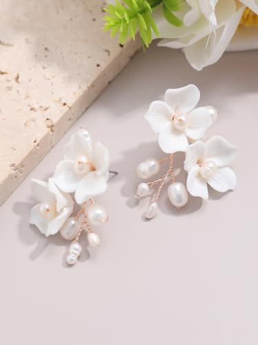 Handmade Ceramic Flower Pearl Stud Earring Drop, White Wedding Prom Accessories Post Earrings Jewelry for Brides Women 6