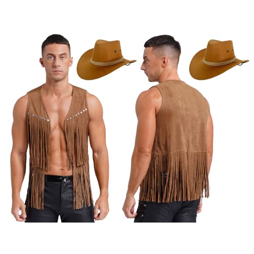 renvena Mens Cowboy Faux Suede Tassel Vest Rivets Fringe Open Front Waistcoat Jacket with Hat 1