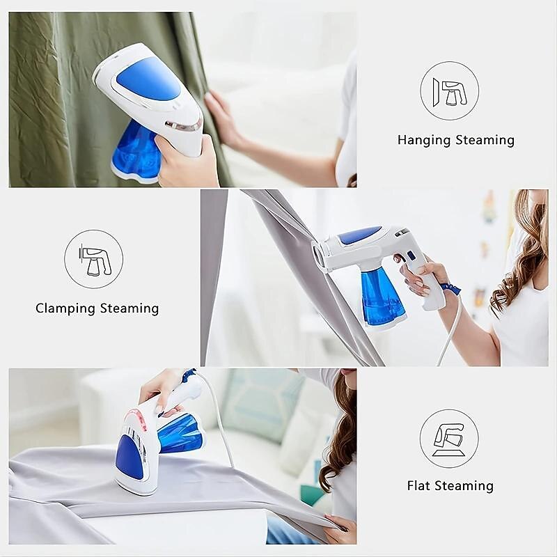 Highlights - [20s Fast Ironing] The 1600W powerful garment steamer heats up and produces steam in just 20 seconds, allowing for fast and efficient ironing. Its large steam head covers a wide area, enabling quick ironing of clothes and saving you time. - [Light Weight & Portable Travel Sized] With its lightweight and compact design, this steamer is easy to carry and fits perfectly in your luggage, making it ideal for travel. Its one-touch button activation allows for easy operation with one hand, and the extended long cord adds convenience. - [3 Steaming Modes & 3 Steaming Levels] This steamer offers three steaming modes (hanging, flat ironing, clamping ironing) and three steaming levels to cater to different types of fabrics, ensuring smooth and effective steaming. - [Safe & Leakproof] The electronic pump system of this clothes steamer prevents water from leaking, providing a safe and worry-free steaming experience. It is ready for use in just 20 seconds, and the 250ml water tank allows for up to 30 minutes of continuous steaming. - [Replaceable Water Tank] To enhance convenience during your vacation or business trip, this steamer comes with a replaceable 350ml drinking water bottle that can be easily attached to the steamer.