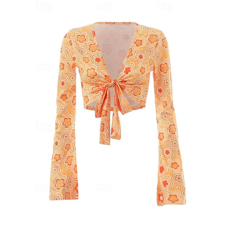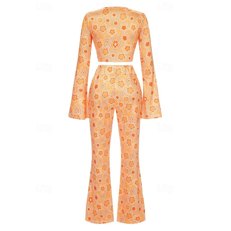Retro Vintage 1970s Outfits Crop Top Bell Bottom Pants Hippie Bow Tie Floral Fancy Dress Women's Halloween Carnival Masquerade Party Daily Wear Adults' Top Pants Spring & Summer 2