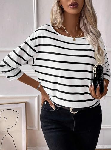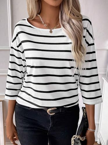 LilyCoco Womens 3/4 Length Sleeve Tops Striped Boat Neck Shirt Frenchy Cotton Tees 6