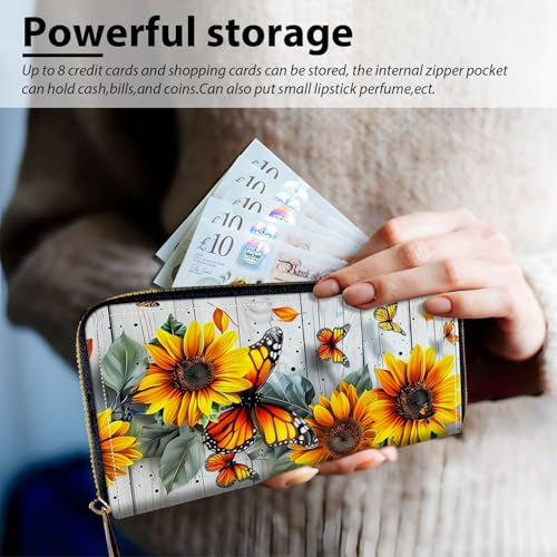 Women's Card Holder Wristlet Wallet, Convenient Travel Long Wallet with Strap and Pink Compact Mirror, Fashion and Sturdy Wristlet Long Purse for Women, Sunflowers Butterflies 6
