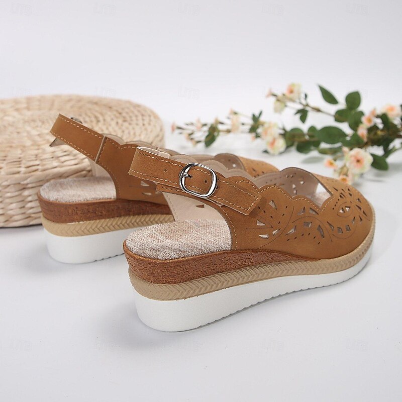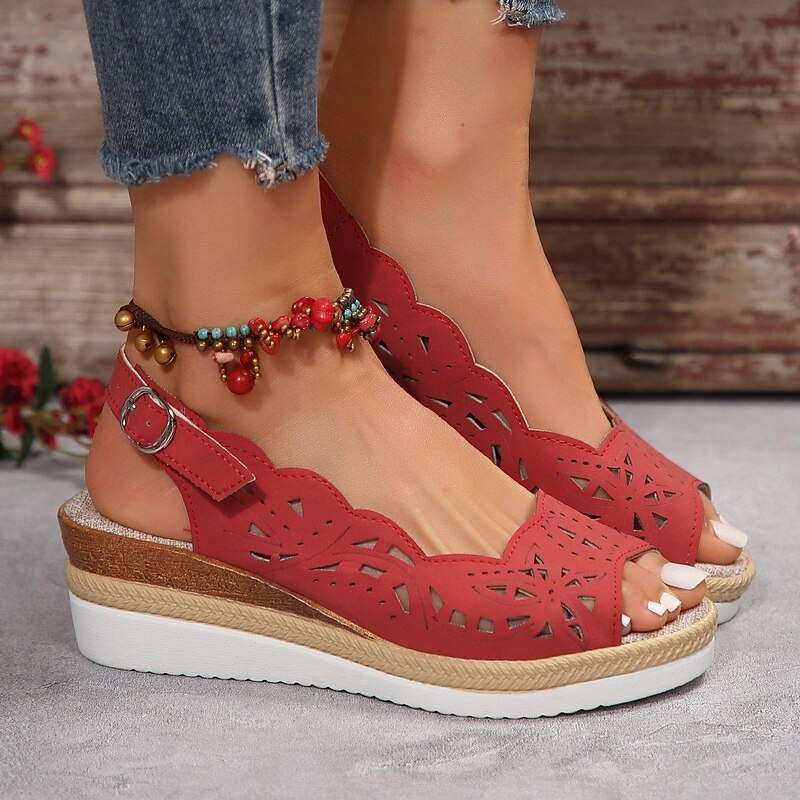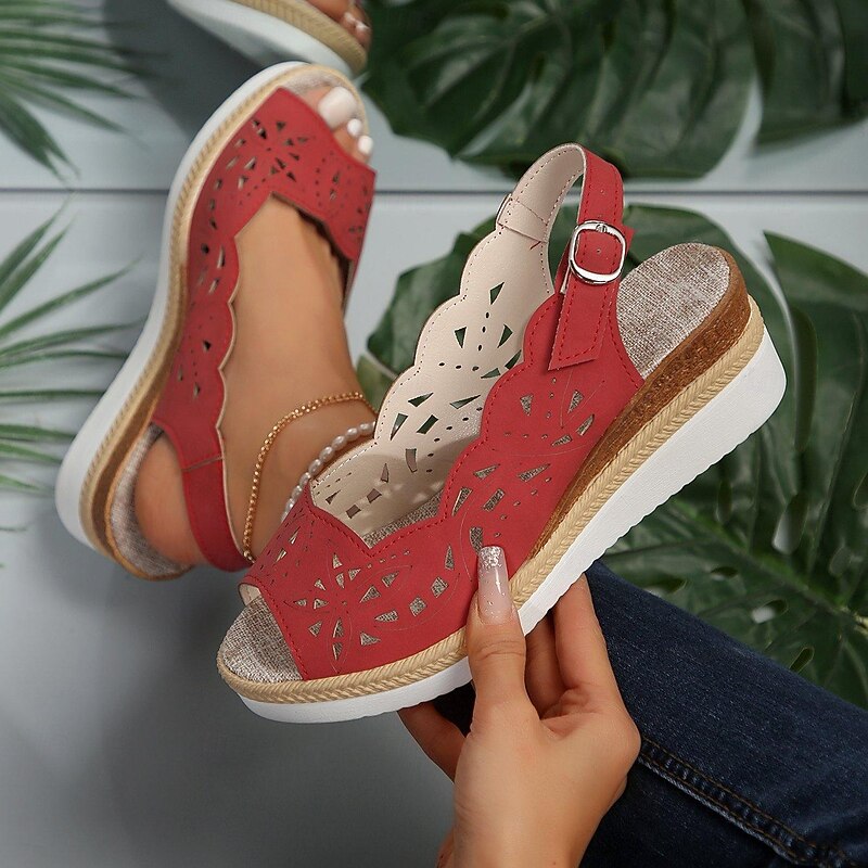 Highlights [Fabric] : The upper material of these sandals is crafted from high-quality PU, offering a soft yet durable texture for long-lasting comfort. [Silhouette] : Designed with a wedge heel type, these sandals feature a platform wedge that adds height without compromising on comfort. The classic peep toe and slingback strap provide a secure fit and easy wear. [Design Highlights] : Showcasing intricate openwork and hollow-out patterns, these sandals are available in classic black, deep wine, and elegant brown colors. The ankle strap comes with an adjustable buckle, ensuring a personalized fit, while the espadrille-style finish adds a natural, summery touch. [Occasions] : Ideal for outdoor events, beach outings, and casual summer days, these sandals seamlessly integrate style and practicality, making them a versatile choice for various occasions. [Size Information] : Available in sizes ranging from US6 to US10.5, please refer to the size chart provided by the supplier for the best fit. Designed to cater to a wide range of foot sizes, these sandals ensure comfort and style for everyone.
