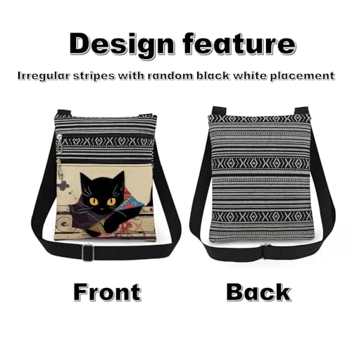 • ​​3. 【Design】​​The Cat crossbody bag uses heat transfer printing technology for fade-resistant patterns. The irregular black-and-white stripes are crafted with a woven process, and their placement varies randomly (positions may differ slightly due to hand-cutting). The dual-pocket design helps efficiently organize different items, while the adjustable strap accommodates most users.