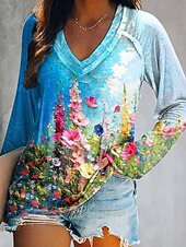 More information about Women's T shirt Long Sleeve Floral Graphic Plants Elegant Bohemia Vintage Long Sleeve V Neck Regular Tops Daily Going out Weekend Print Yellow Blue Spring Fall Prefall