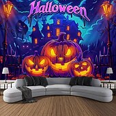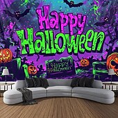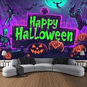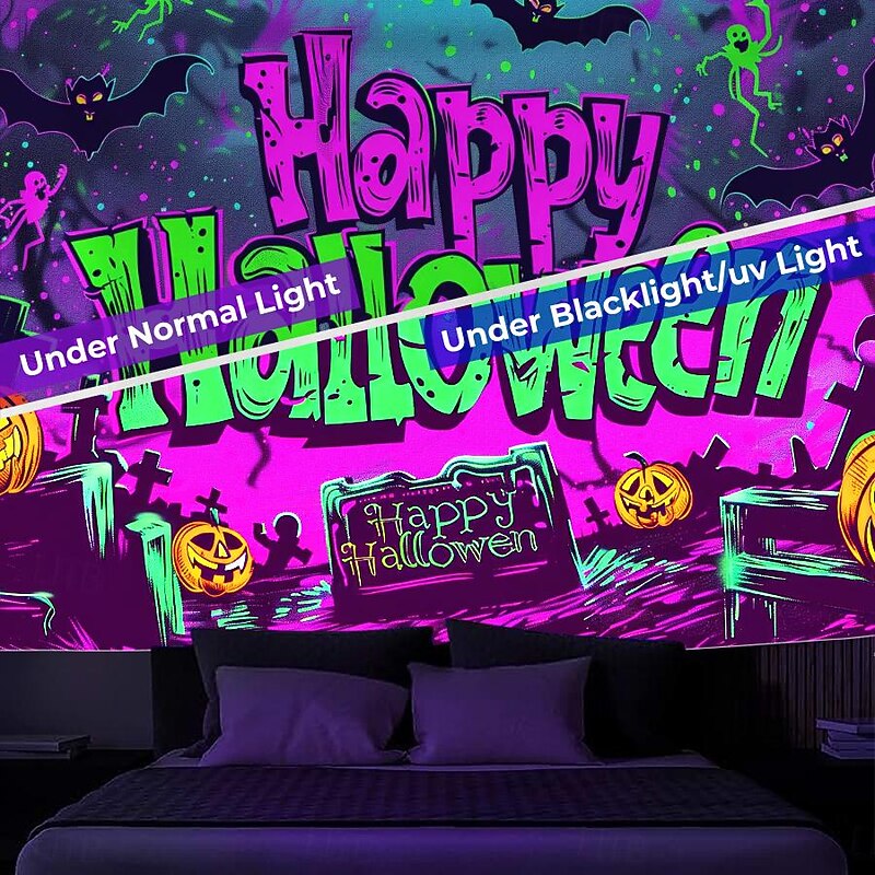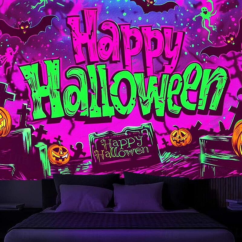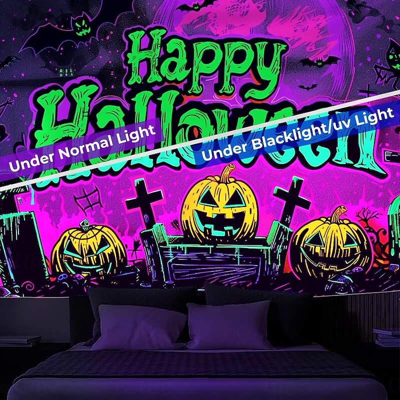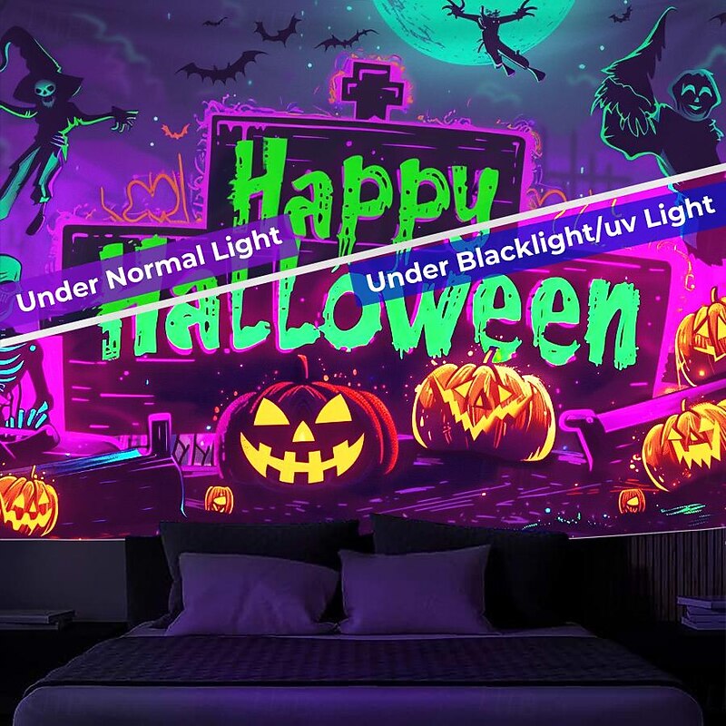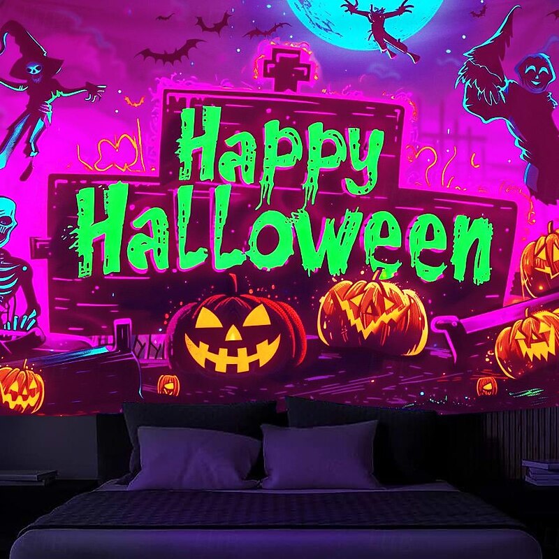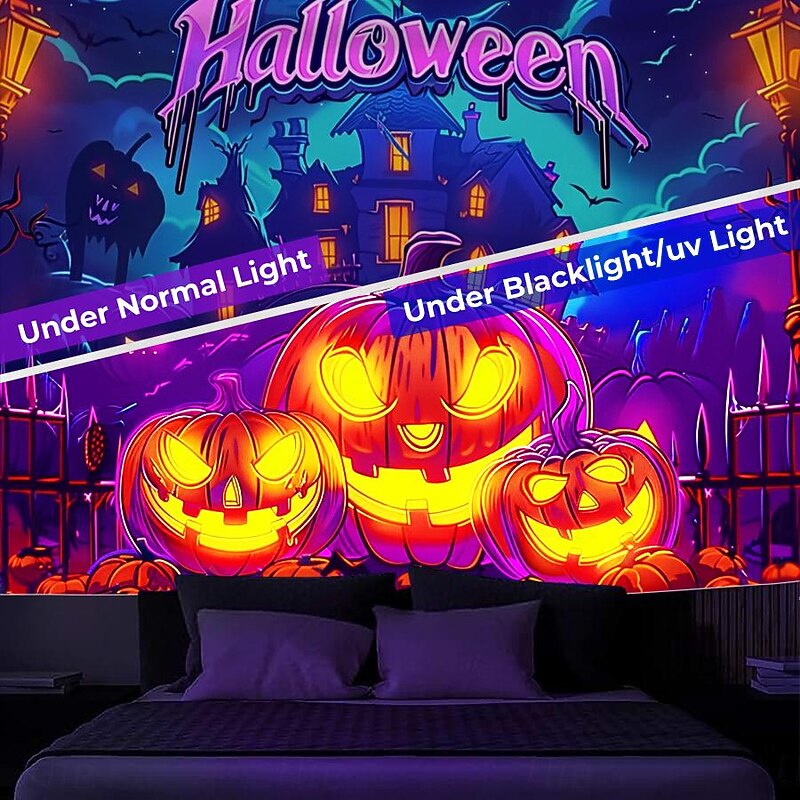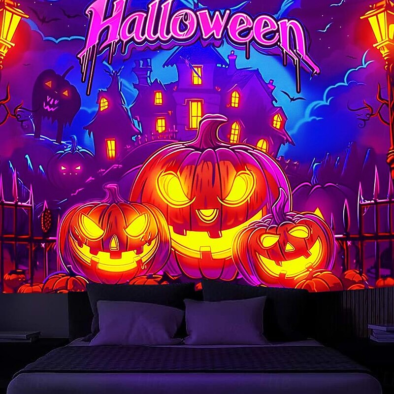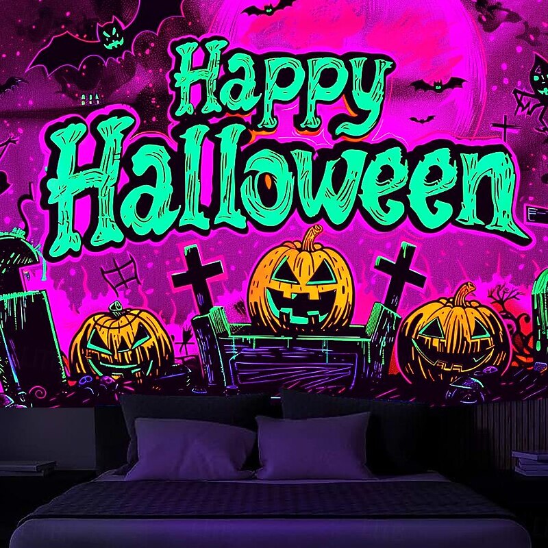 HOT ! Halloween Decorations Pumpkin Blacklight Tapestry UV Reactive Glow in the Dark Forest Trippy Mountain Misty Graveyard Ghost Hanging Tapestry Wall Art Mural for Living Room Bedroom