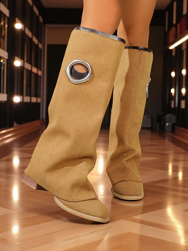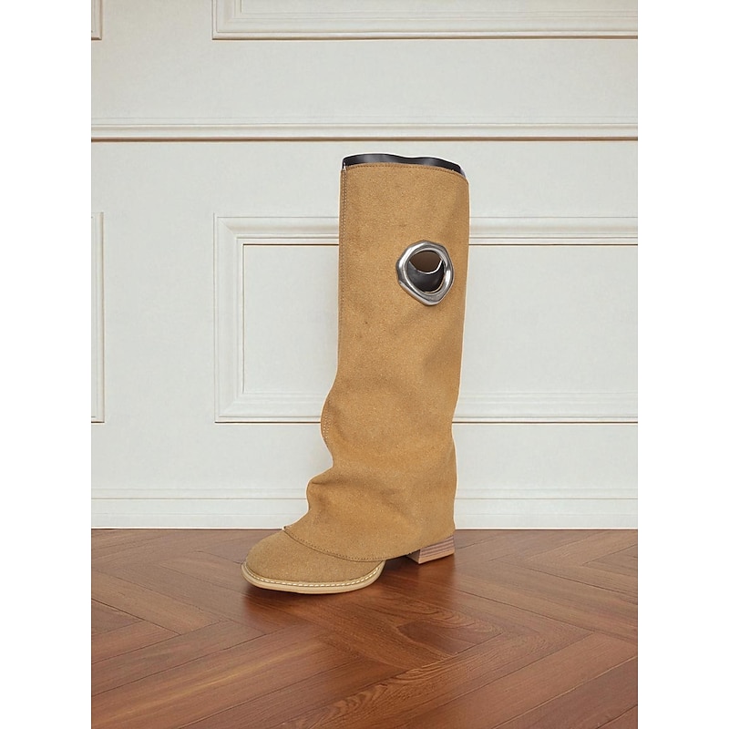 More information about Women's Suede Fold-Over Shaft Boots with Metal Ring Detail - Fashion Knee High Flip Bucket Design, Trendy Urban Style Footwear for Women's Casual Streetwear and Modern City Outfits