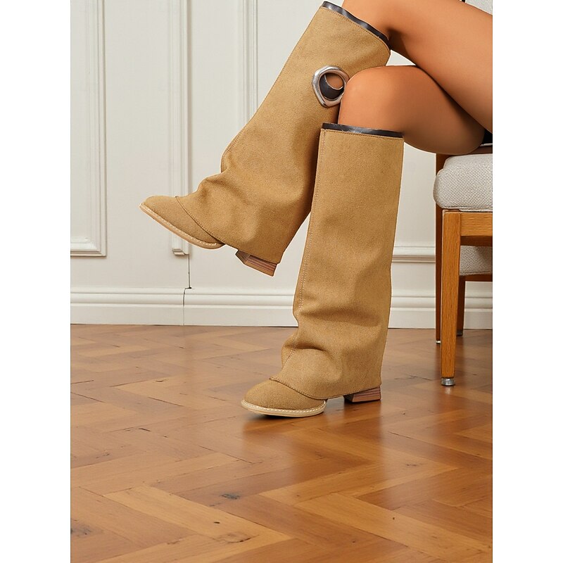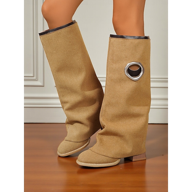 HOT ! Women's Suede Fold-Over Shaft Boots with Metal Ring Detail - Fashion Knee High Flip Bucket Design, Trendy Urban Style Footwear for Women's Casual Streetwear and Modern City Outfits