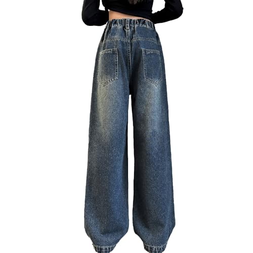 HOT ! Tween Girls Baggy Jeans-Bow Embroidery Wide Leg Denim Pants with Pockets, Elastic Waistband Pants for Girls