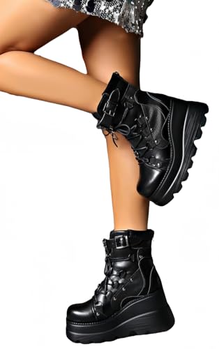 Womens Goth Platform Boots Chunky High Heel Booties Round Toe Combat Ankle Boots Womens Lace Up Motorcycle Wedges Shoes 1