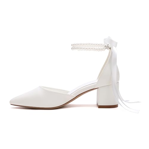 Women's Block Heel Pearl Satin Closed Pointed Toe Chunky Low Heel Pump Sandal Party Wedding Dress Shoes 5