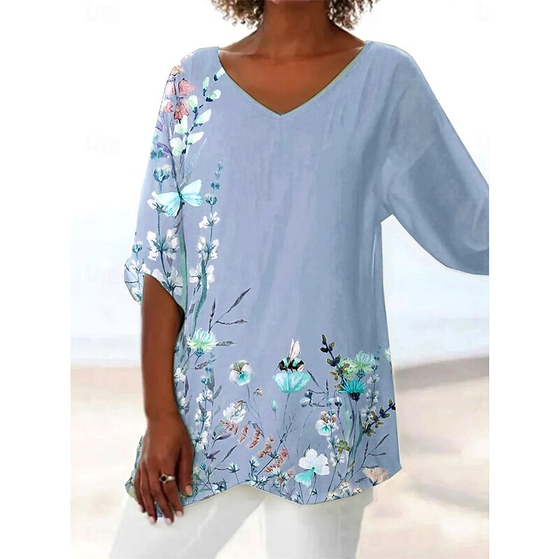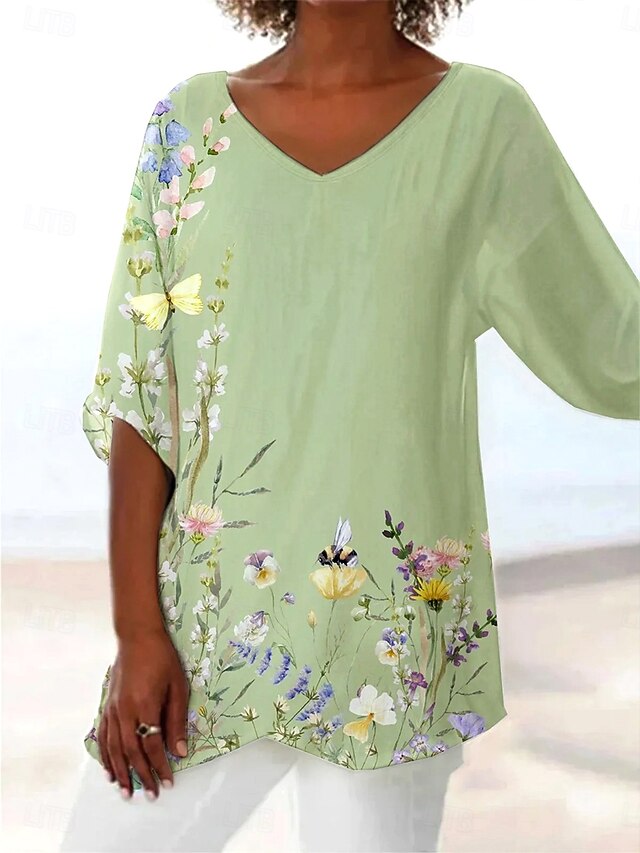 HOT ! Women's Blouse Long Sleeve Asymmetrical Hem Floral Graphic Leaf Hawaiian Stylish Casual 3/4 Length Sleeve V Neck Regular Tops Daily Holiday Going out Print Asymmetric Hem Light Green Violet