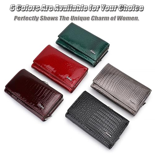 HOT ! Genuine Patent Leather Trifold Wallet for Women - Compact Kiss-lock Coin Purse with Crocodile Embossed Texture, RFID-blocking Card Holder - 8 Card Slots | ID/Photo Window - Green