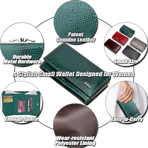 More information about Genuine Patent Leather Trifold Wallet for Women - Compact Kiss-lock Coin Purse with Crocodile Embossed Texture, RFID-blocking Card Holder - 8 Card Slots | ID/Photo Window - Green