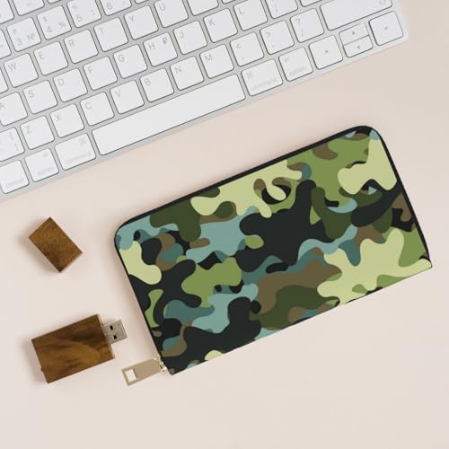 HOT ! Black Green Camo Print Wallet Women Men, Long PU Leather Wallets for Women, Cute Womens Travel Wallet Purse Pouch with Zipper Pocket