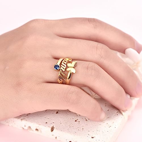 10K 14K 18K Solid Gold Butterfly Rings for Women Personalized, Custom Name Ring Bands with Birthstone Jewelry Gift for Engagement Mother's Day Christmas Birthday Size 4-12 4