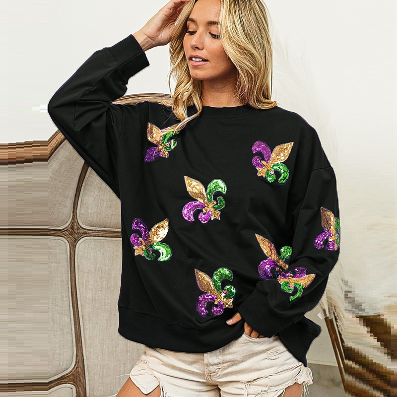Women's Mardi Gras Shirt Blouse Women's Black White Purple Graphic Sequins Party Casual Active Sportswear Round Neck Regular Fit Carnival Theme 4