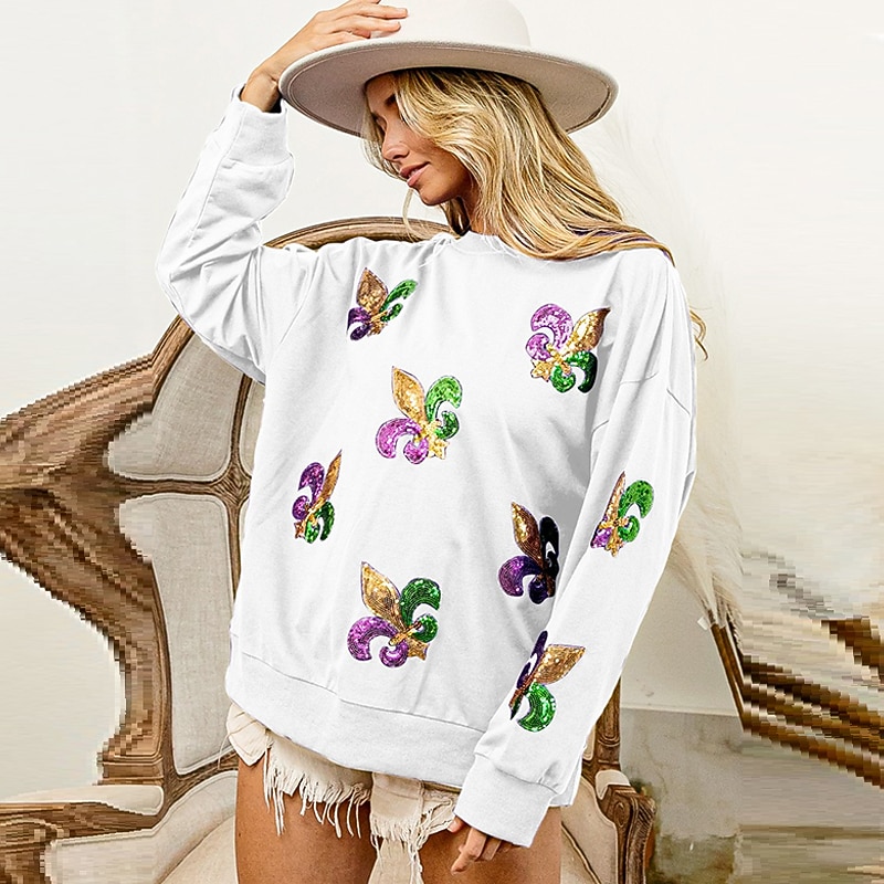 Women's Mardi Gras Shirt Blouse Women's Black White Purple Graphic Sequins Party Casual Active Sportswear Round Neck Regular Fit Carnival Theme 13