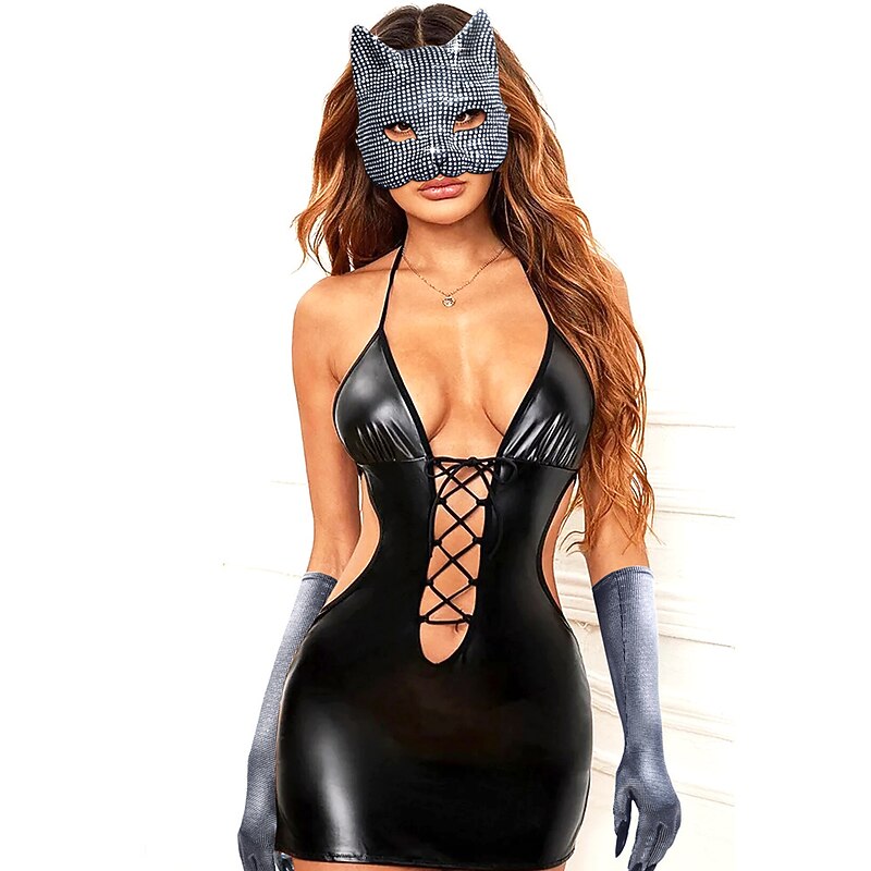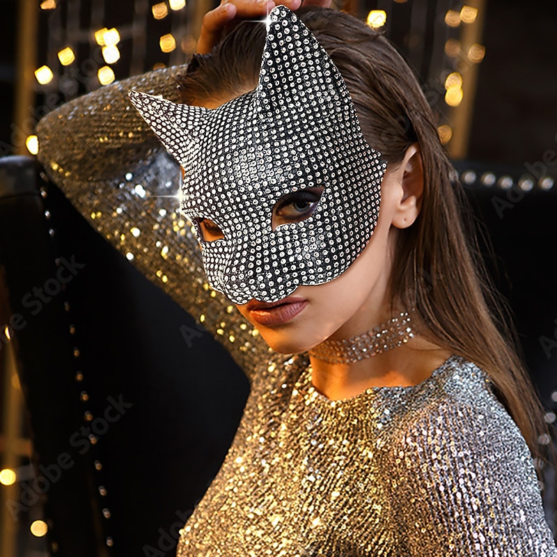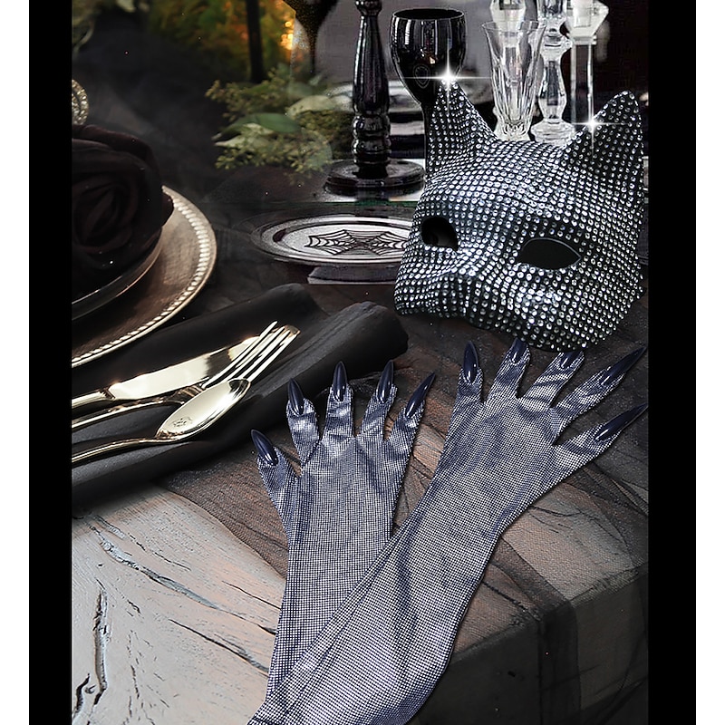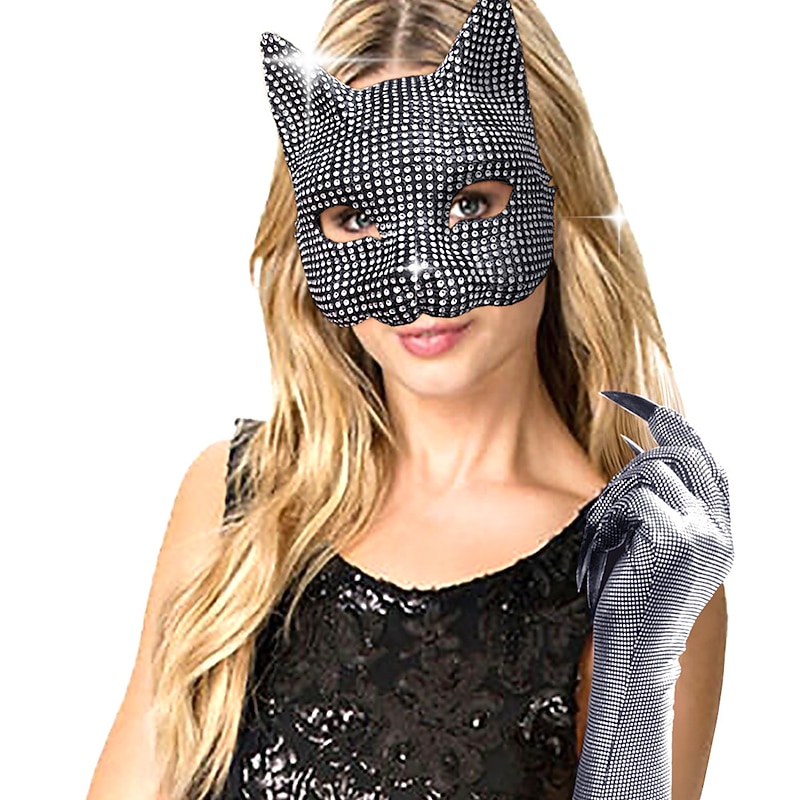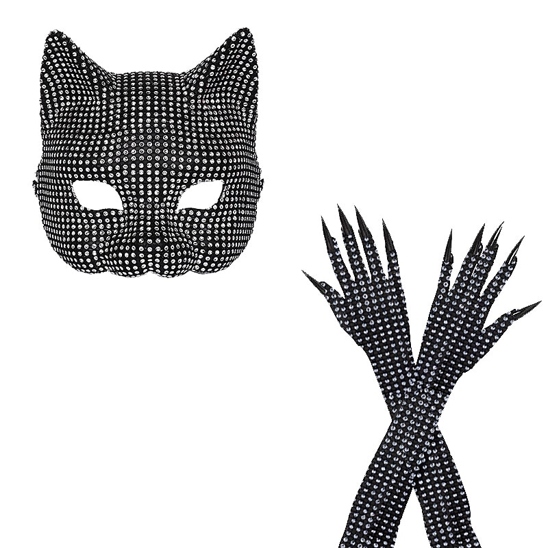 Highlights [Fabric] Crafted from high-quality polyester, the material of this striking ensemble features a shiny metallic finish, offering a smooth, stretchy, and comfortable fit. Its shimmering silver color reflects light beautifully, making it perfect for standing out at any event. [Silhouette and Style] The silhouette of the outfit is designed to be form-fitting, highlighting and accentuating the wearer’s figure. The overall look combines elements of sexy, punk, and gothic styles, embodying a bold and glamorous aesthetic with a shiny metallic twist. [Design Highlights] This ensemble includes a cat mask and long gloves, both adorned with sparkling rhinestones. The cat mask adds an element of mystery and elegance, while the elbow-length gloves complement the sleeveless, deep neckline dress, creating a dramatic and cohesive look. [Occasions] Ideal for themed events such as Carnival and New Year, the outfit is perfect for party evenings and club wear. Its eye-catching design and glamorous details make it suitable for those who love to make a fashion statement at any social gathering. [Size Notice] The outfit is available in a one-size-fits-most style, tailored to fit a range of body types comfortably. Please refer to the fit description to ensure that the ensemble suits your desired look and occasion.