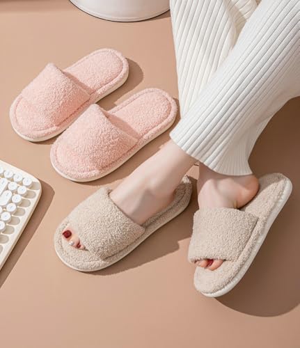 HOT ! Caistre Womens Slides Fuzzy Slippers Open Toe Fluff Slippers Soft Cozy House Shoes Furry Bedroom Memory Foam Shoes with Arch Support