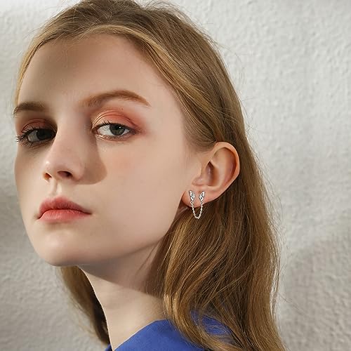Cute Tiny Butterfly CZ Double Piercing Huggie Small Stud With Short Chain 925 Sterling Silver Cuff Wrap Earrings for Women Cartilage Two Holes Animal Dangle Drop Hypoallergenic 3