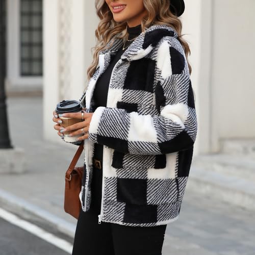 HOT ! Womens Fleece Sherpa Jackets Fall Winter Full Zip Plaid Coat with Pocket
