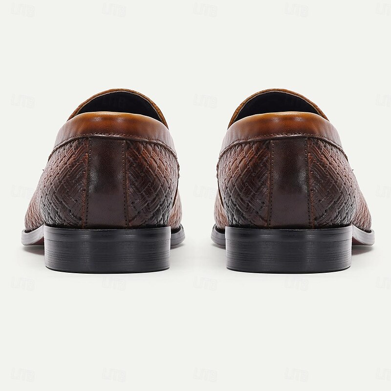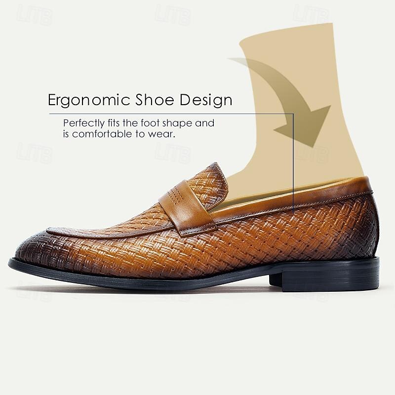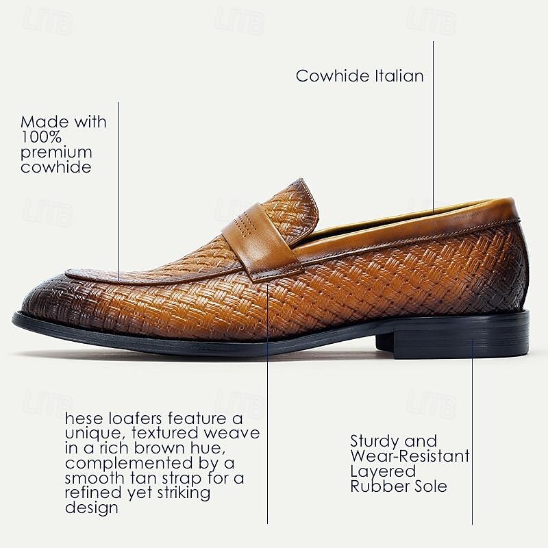 Highlights [Fabric] Crafted from premium Italian full-grain cowhide leather, these men's loafers showcase exceptional durability and a luxurious feel. The leather's rich texture offers both elegance and long-lasting wear, ensuring that each step is taken in style. [Style] These loafers feature a classic round toe slip-on design, making them an easy and convenient choice for everyday elegance. The smooth leather band across the top with subtle perforation detailing adds a refined touch to the timeless silhouette. [Design Highlights] Intricately woven leather patterns enhance the visual appeal, providing a unique and sophisticated flair. The contrast strap detail further elevates the loafers, offering a modern twist to the traditional style, while the EVA outsole ensures a comfortable and slip-resistant experience. [Occasions] Ideal for formal events, business meetings, and elegant social gatherings, these loafers transition seamlessly from professional settings to refined casual occasions. Whether paired with a suit or tailored trousers, they provide a stylish and versatile option for any sartorial need. [Size Range] Available in a wide range of sizes from US6 to US13, these loafers cater to a variety of foot sizes, ensuring an accurate and comfortable fit for every gentleman.