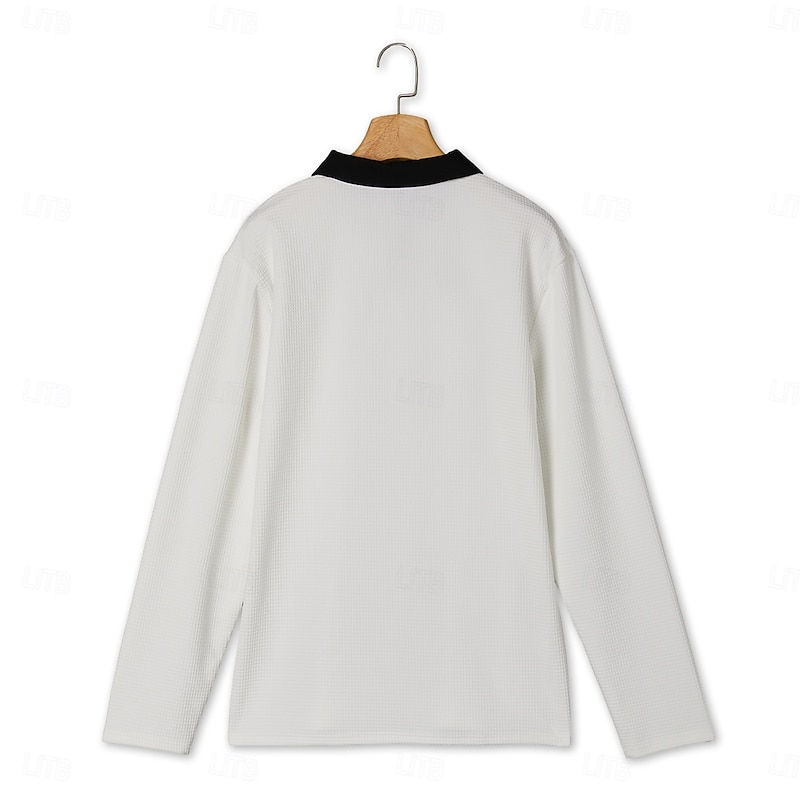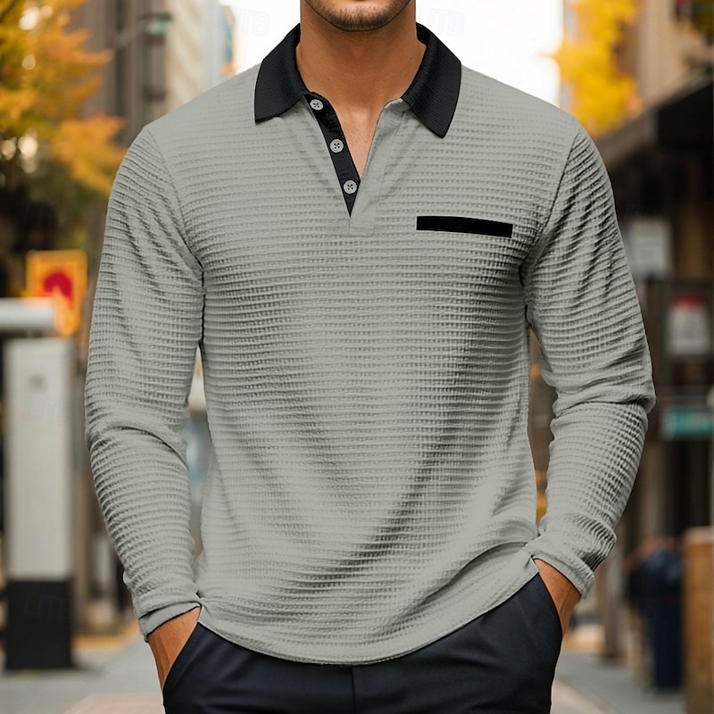 Highlights [Fabric] Crafted from high-quality waffle knit fabric, this men's polo shirt offers both warmth and breathability, making it an ideal choice for the transitional seasons of spring and fall. The blend of materials ensures a soft feel and durable wear, providing a comfortable fit for various body types. [Fit] The long-sleeve design features a classic yet modern fit that is both stylish and versatile. Its tailored shape flatters the body without being restrictive, allowing easy movement and comfort throughout the day. [Design Highlights] This elegant polo shirt boasts a sophisticated ribbed collar and button-placket, elevating the traditional polo style with a fashion-forward twist. A sleek pocket with black trim adds functional detail and a touch of trendy contrast to the solid color design. [Occasions] Perfectly suitable for formal, business, and casual occasions, this shirt seamlessly transitions from office meetings to weekend gatherings. Its versatile style makes it a wardrobe staple for any event, providing a polished look without compromising on comfort. [Size Range] Available in a range of sizes from S to 3XL, this shirt ensures a comfortable fit for individuals of various sizes, making it accessible for a wide audience seeking both style and practicality.