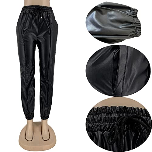 Tcremisa Women's Faux Leather Pants Drawstring Elastic High Waist Joggers Casual Loose Trousers with Pockets 4