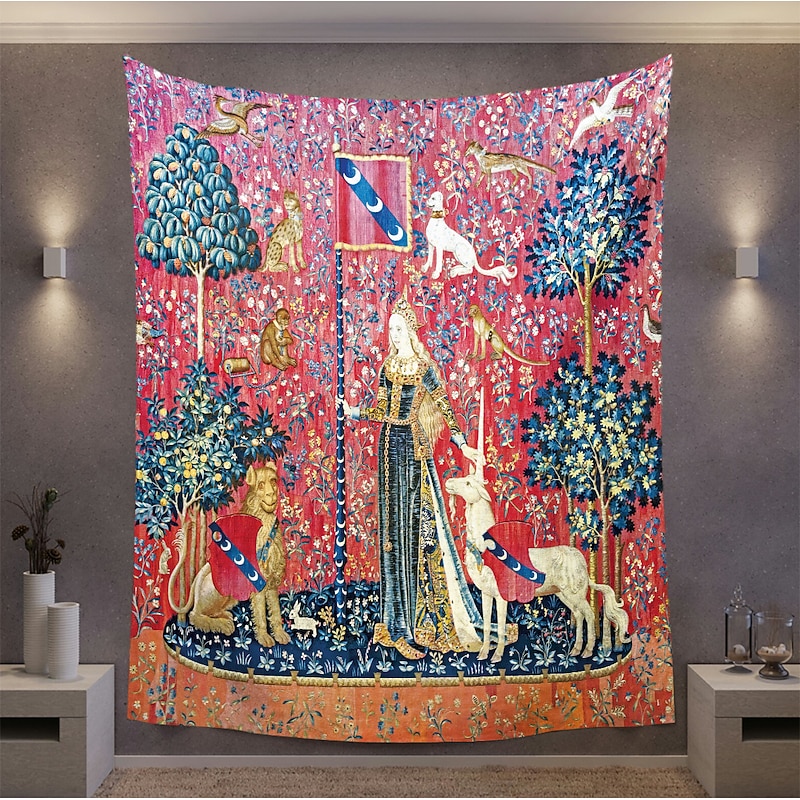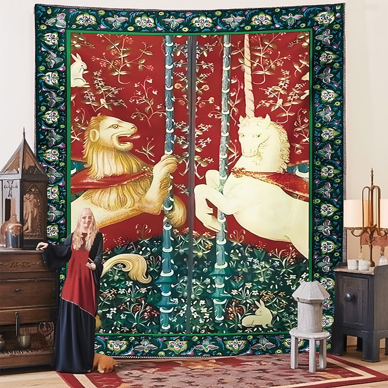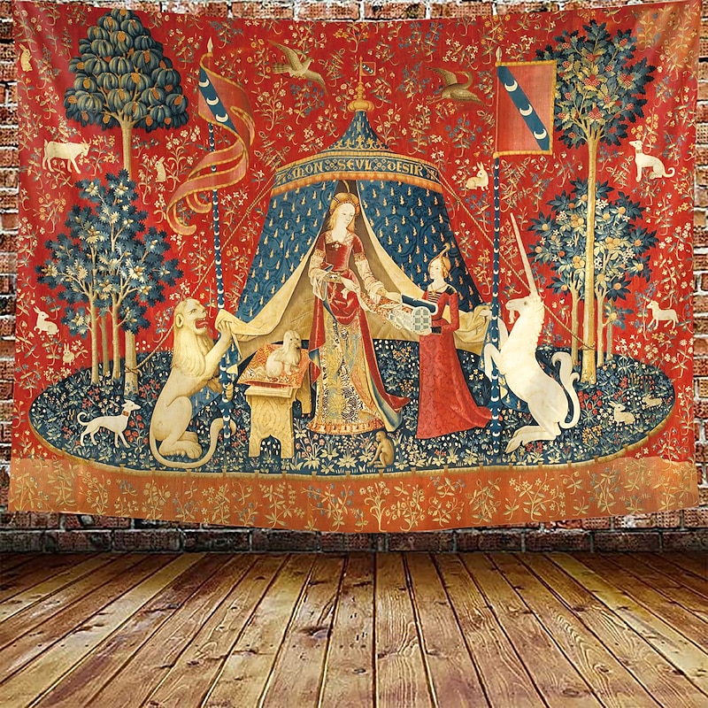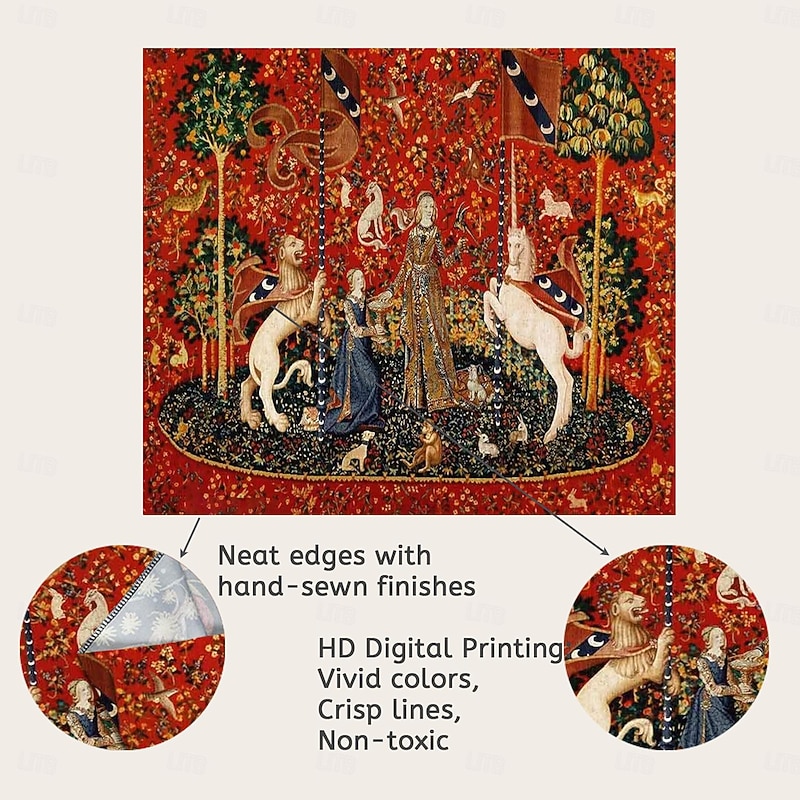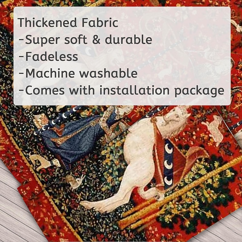 Highlights Dating back to the late 15th century, the Lady Unicorn Tapestry is part of a famous series known as "The Hunt of the Unicorn." This series consists of seven tapestries, each depicting various stages of the hunt for the mythical creature. The Lady Unicorn Tapestry, in particular, showcases the capture of the unicorn by a group of noblemen and hunters. 【Durable Construction】 Crafted with high-quality polyester fabric, this tapestry is built to last. Its robust composition ensures that you can enjoy its beauty for years to come. 【Soft and Lightweight】 This tapestry is soft to the touch and lightweight, making it perfect for both indoor and outdoor use. 【Multiple Size Options】 Available in different sizes to accommodate any room's dimensions. 【Intricate Design】 The tapestry features a captivating design inspired by life itself. Its vivid imagery, crisp lines, and vibrant colors will become a conversation piece in any room. 【Versatility at Its Best】 Not just for wall decor, this tapestry can also double as a tablecloth or a picnic blanket, adding functional versatility to its artistic charm. 【Note】 1. Please allow 1-2cm (0.4"-0.8") deviations due to manual measurement. 2. Please understand the tiny color vary from the product due to different light and screen display.