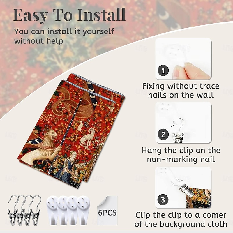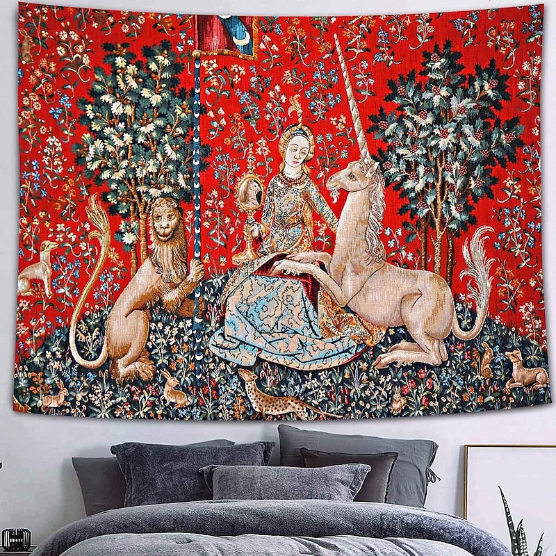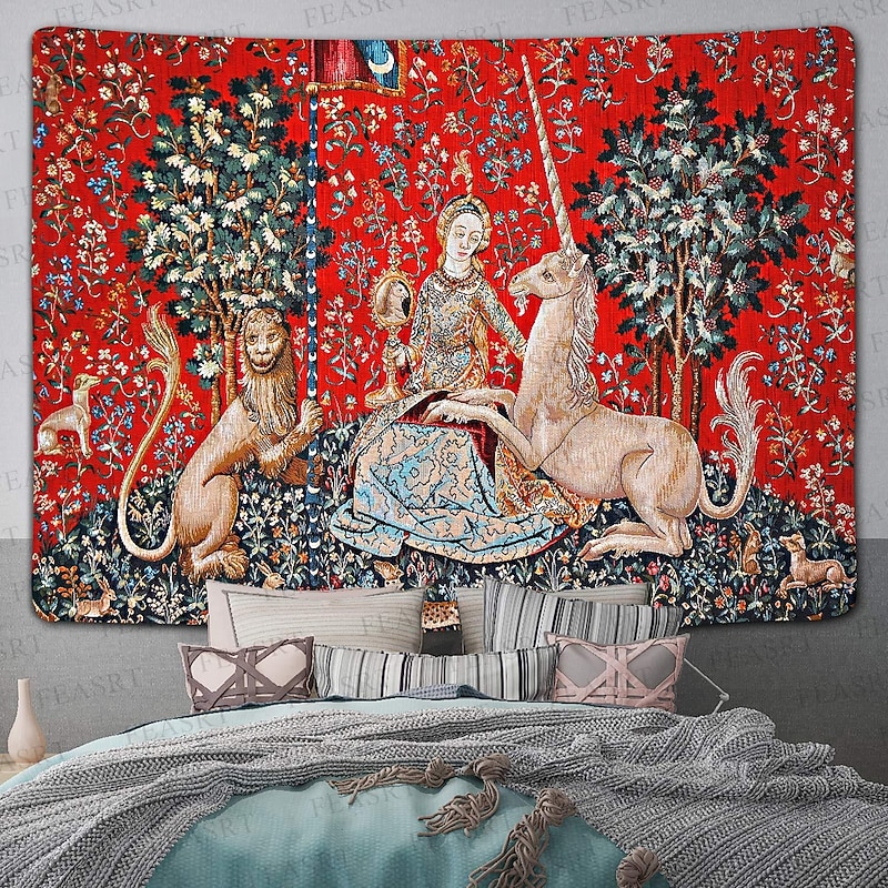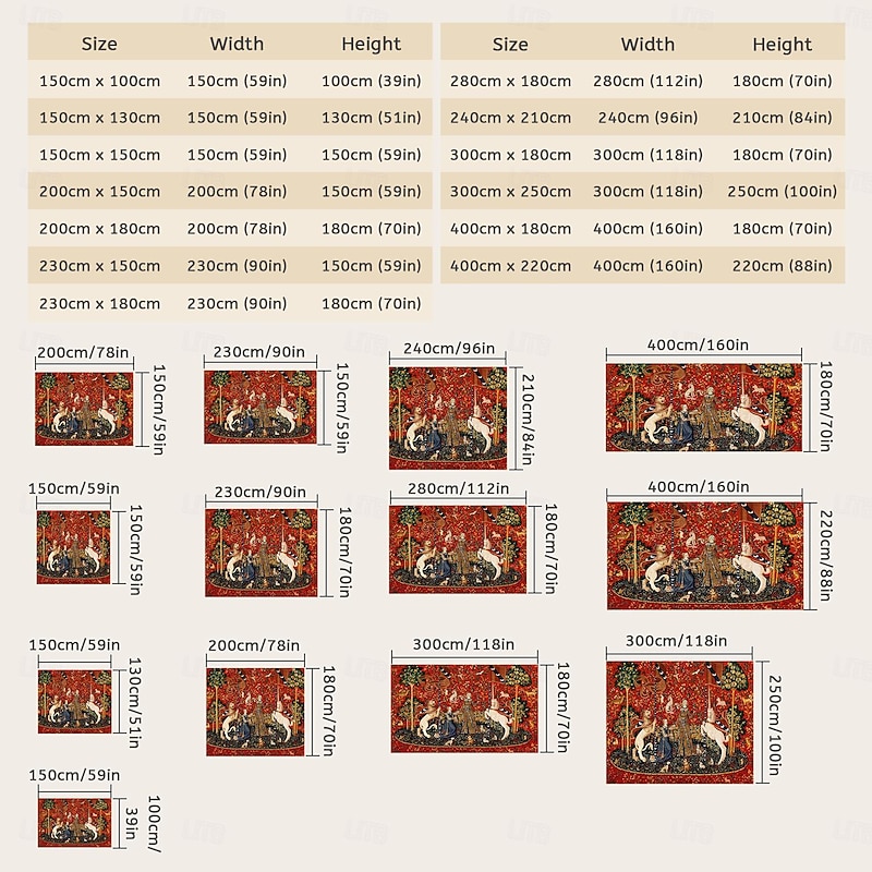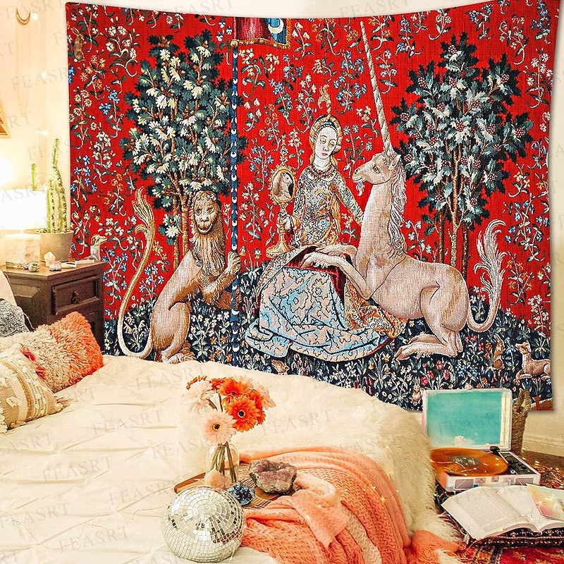 Highlights Dating back to the late 15th century, the Lady Unicorn Tapestry is part of a famous series known as "The Hunt of the Unicorn." This series consists of seven tapestries, each depicting various stages of the hunt for the mythical creature. The Lady Unicorn Tapestry, in particular, showcases the capture of the unicorn by a group of noblemen and hunters. 【Durable Construction】 Crafted with high-quality polyester fabric, this tapestry is built to last. Its robust composition ensures that you can enjoy its beauty for years to come. 【Soft and Lightweight】 This tapestry is soft to the touch and lightweight, making it perfect for both indoor and outdoor use. 【Multiple Size Options】 Available in different sizes to accommodate any room's dimensions. 【Intricate Design】 The tapestry features a captivating design inspired by life itself. Its vivid imagery, crisp lines, and vibrant colors will become a conversation piece in any room. 【Versatility at Its Best】 Not just for wall decor, this tapestry can also double as a tablecloth or a picnic blanket, adding functional versatility to its artistic charm. 【Note】 1. Please allow 1-2cm (0.4"-0.8") deviations due to manual measurement. 2. Please understand the tiny color vary from the product due to different light and screen display.