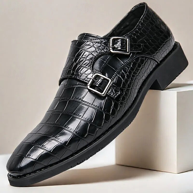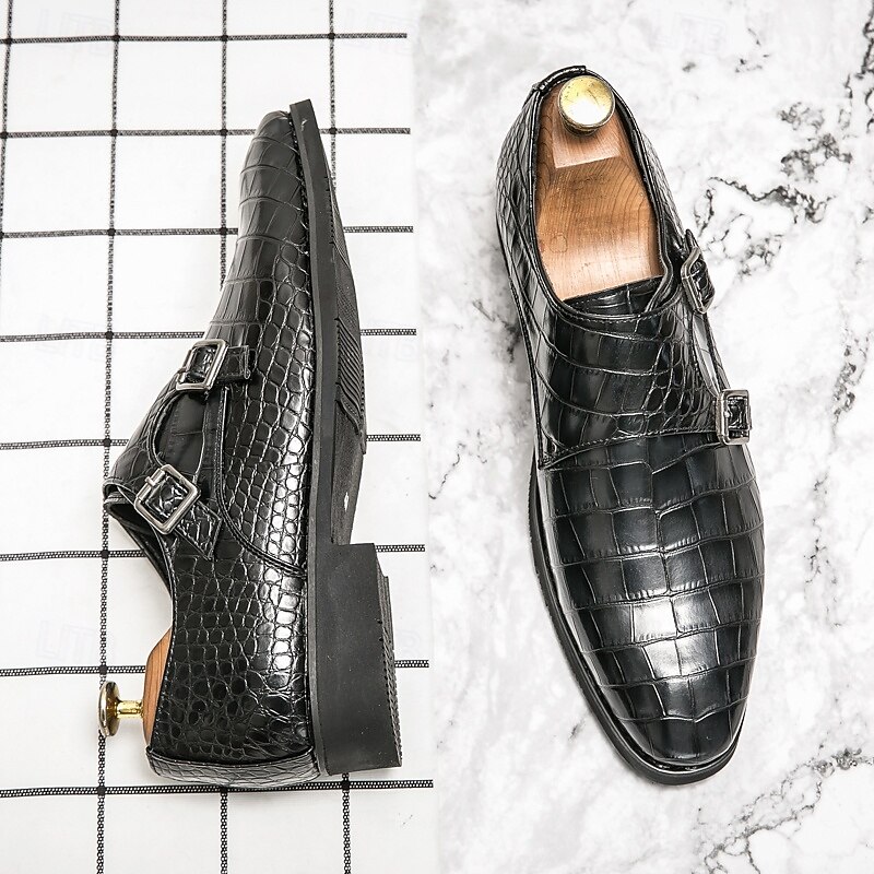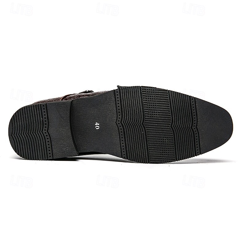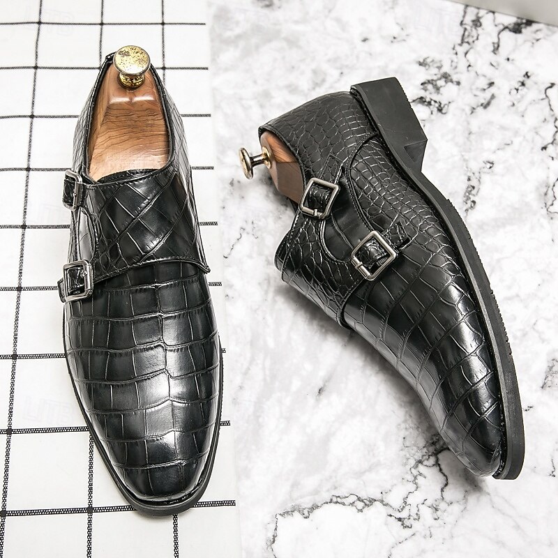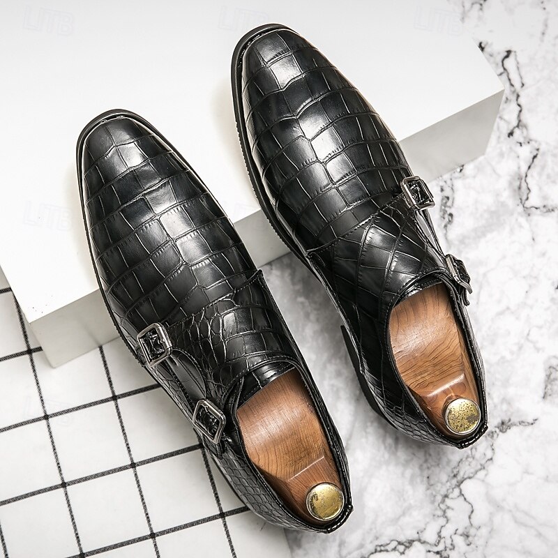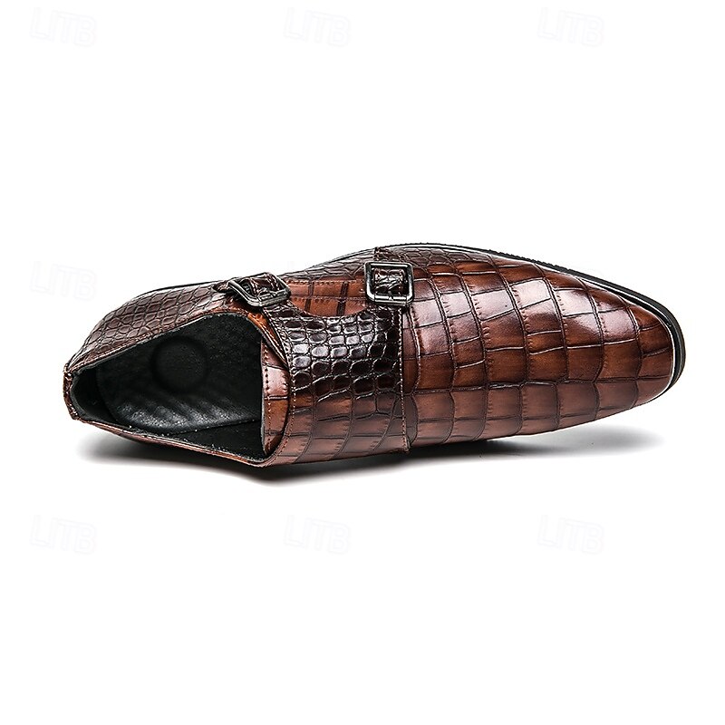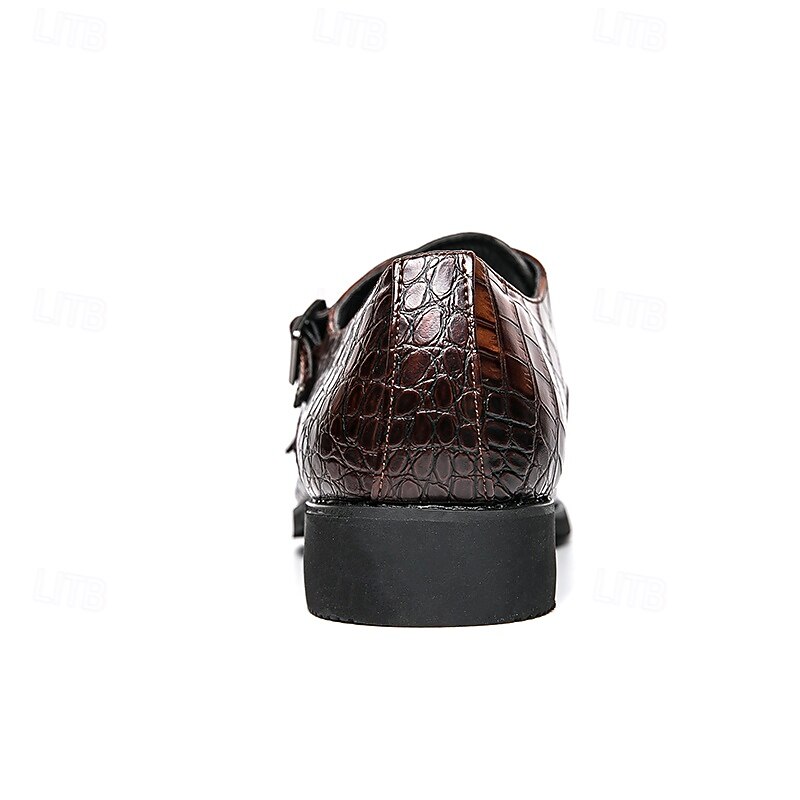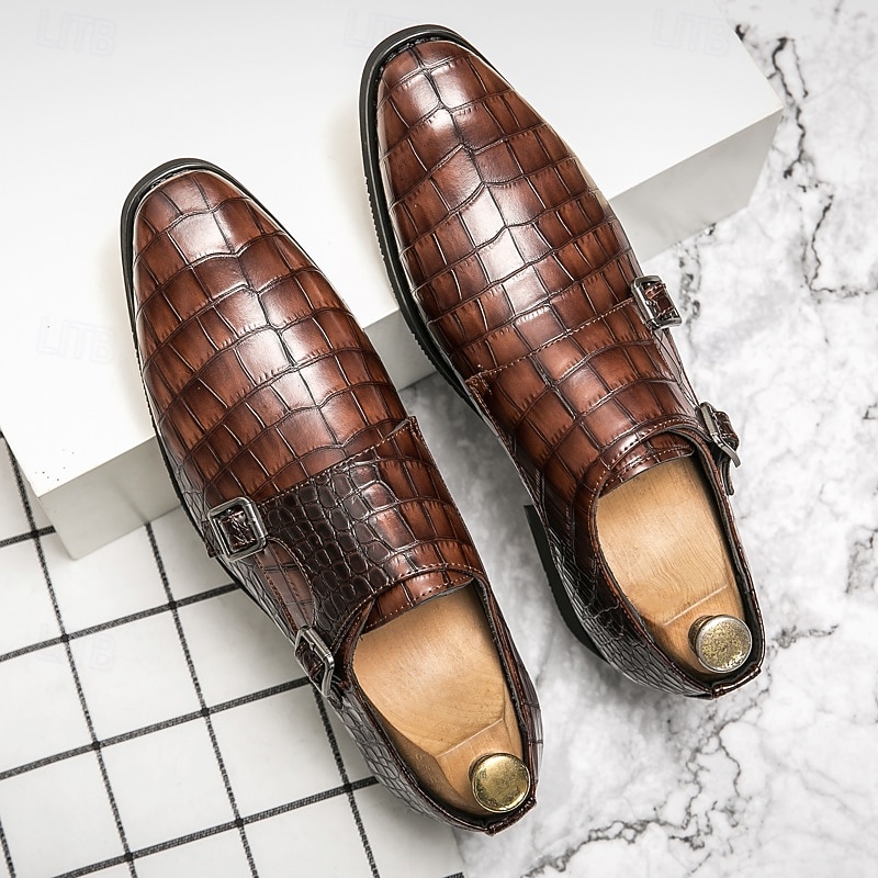 Highlights [Men's Brown Faux Leather Monk Strap Shoes Highlights:] [Material:] Expertly crafted from high-quality PU leather, these monk strap shoes feature a sophisticated crocodile pattern, offering a luxurious look and feel. The durable materials ensure long-lasting wear and a refined finish. [Fit and Style:] Designed with a sleek double monk strap, these shoes provide a classic and elegant fit. The round toe shape and low heel are tailored for both comfort and style, making them ideal for formal settings. [Design Highlights:] The standout feature of these shoes is the striking crocodile pattern, paired with polished metal buckles that offer an adjustable fit. The combination of these elements adds a subtle touch of modern sophistication to the traditional monk strap design. [Occasions:] Perfect for business meetings, weddings, and special occasions, these shoes elevate any formal attire. Their versatile brown color ensures they complement various outfits, making them a staple in any wardrobe. [Size Range:] Available in a wide range of sizes from US6-12 / EU38-45 / UK5-11, these shoes cater to various foot sizes, ensuring a tailored fit for every gentleman seeking style and comfort.