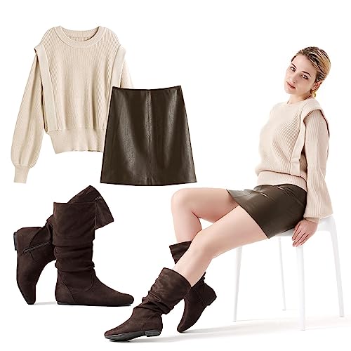 katliu Women's Slouchy Mid Calf Boots Zip up Flat Boots 6