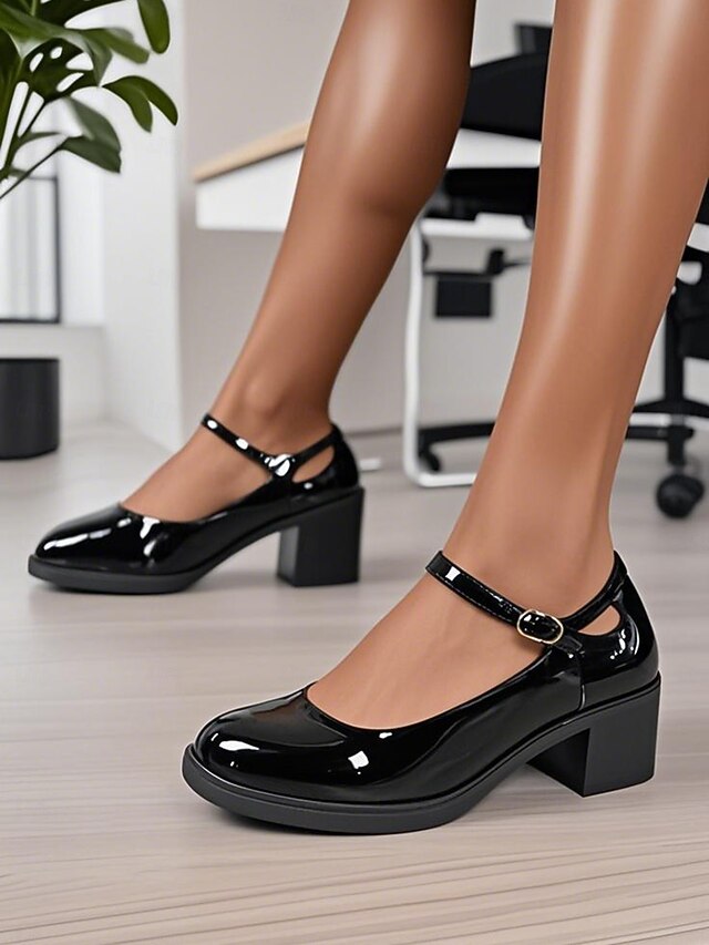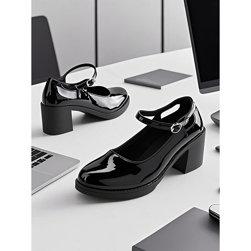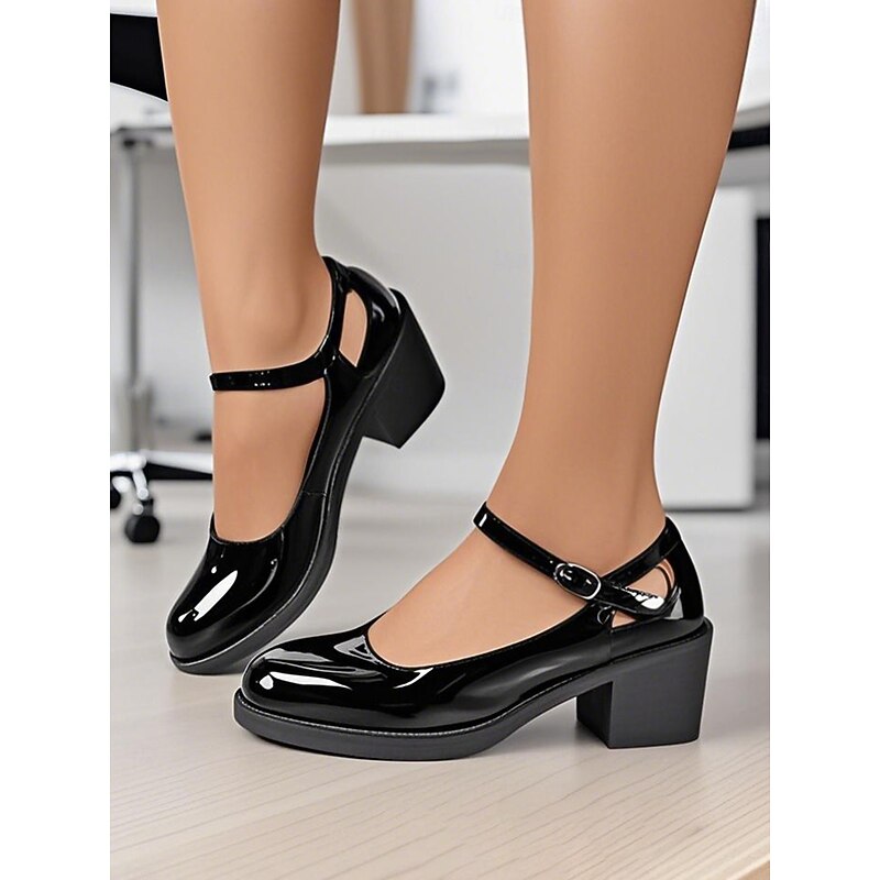 HOT ! Women's Black Patent Leather Mary Jane Block Heels – Classic Office Pumps for Formal & Business Wear